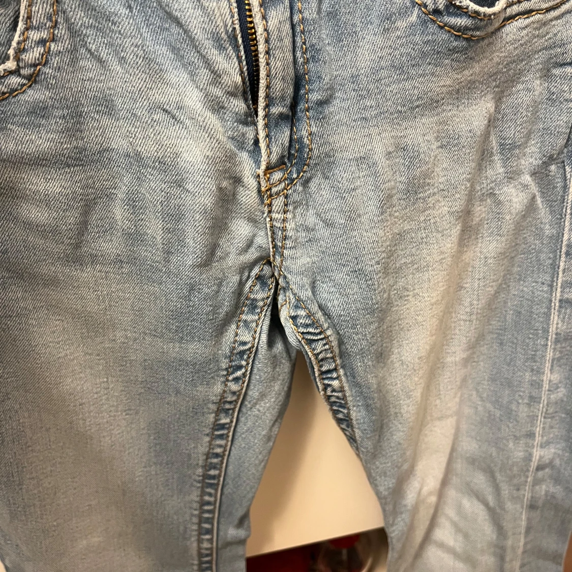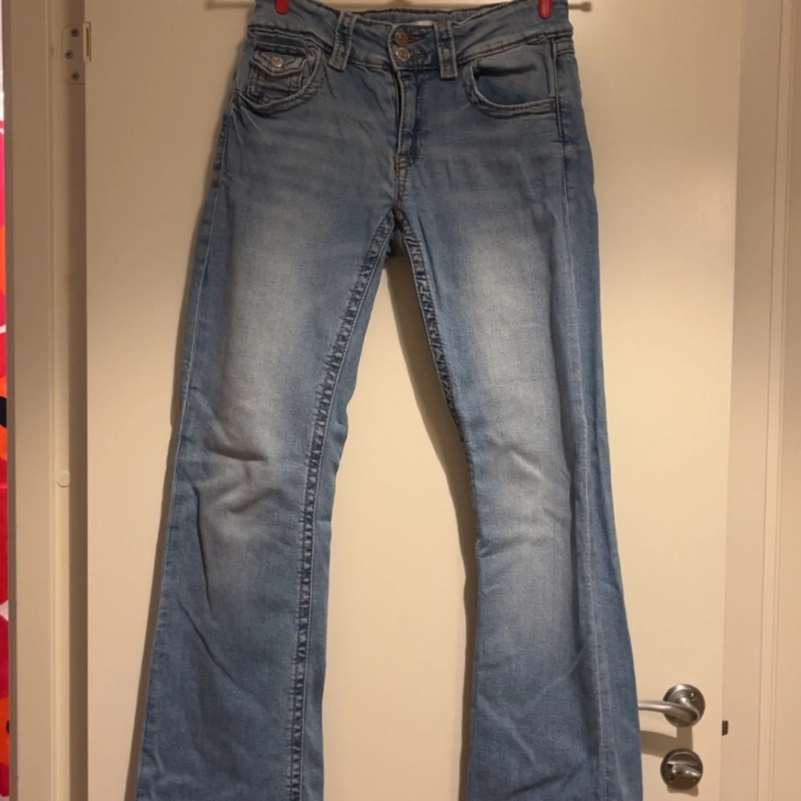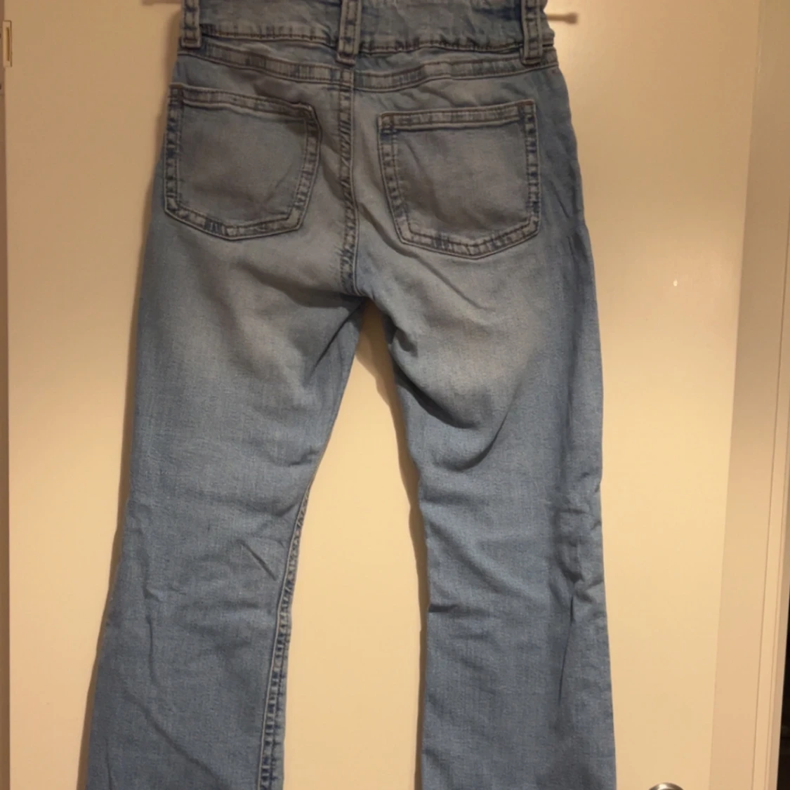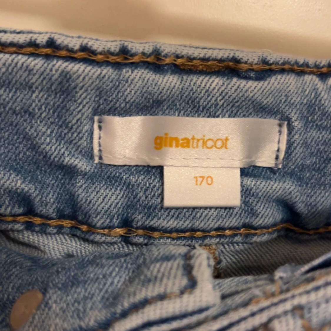 Snygga blå bootcut jeans från Gina Tricot Young med en femficksdesign. Jeansen har en knapp- och dragkedjestängning framtill. OBS! Stretchen har släppt där fram på byxan (se bild) därav det låga priset! Har dock inga fläckar💕