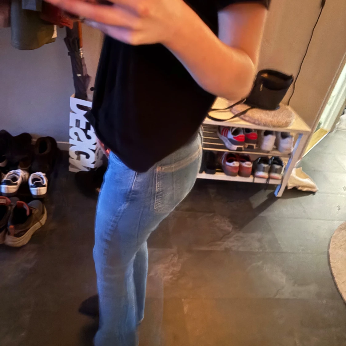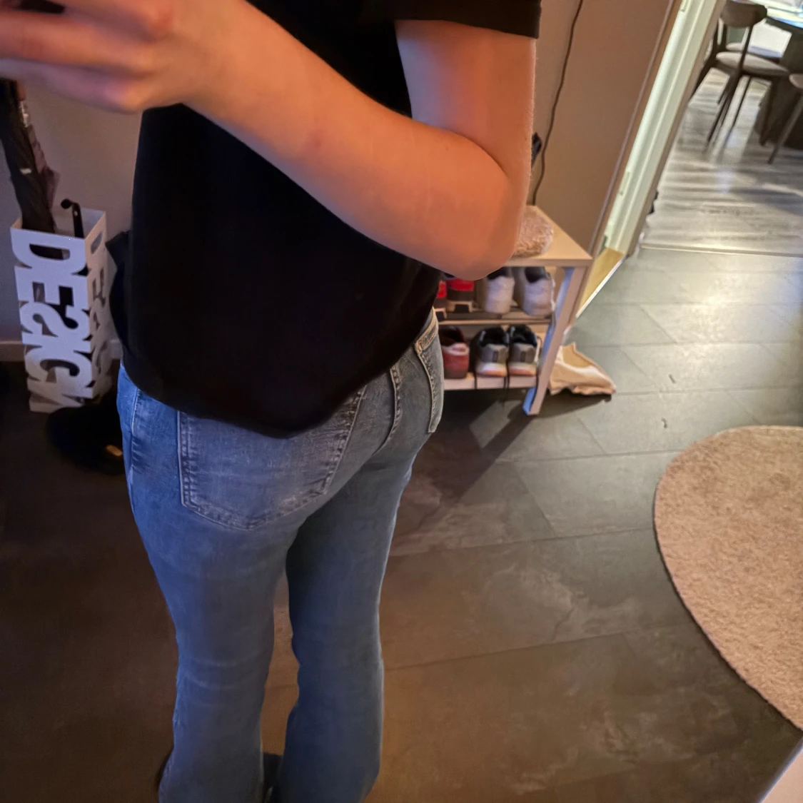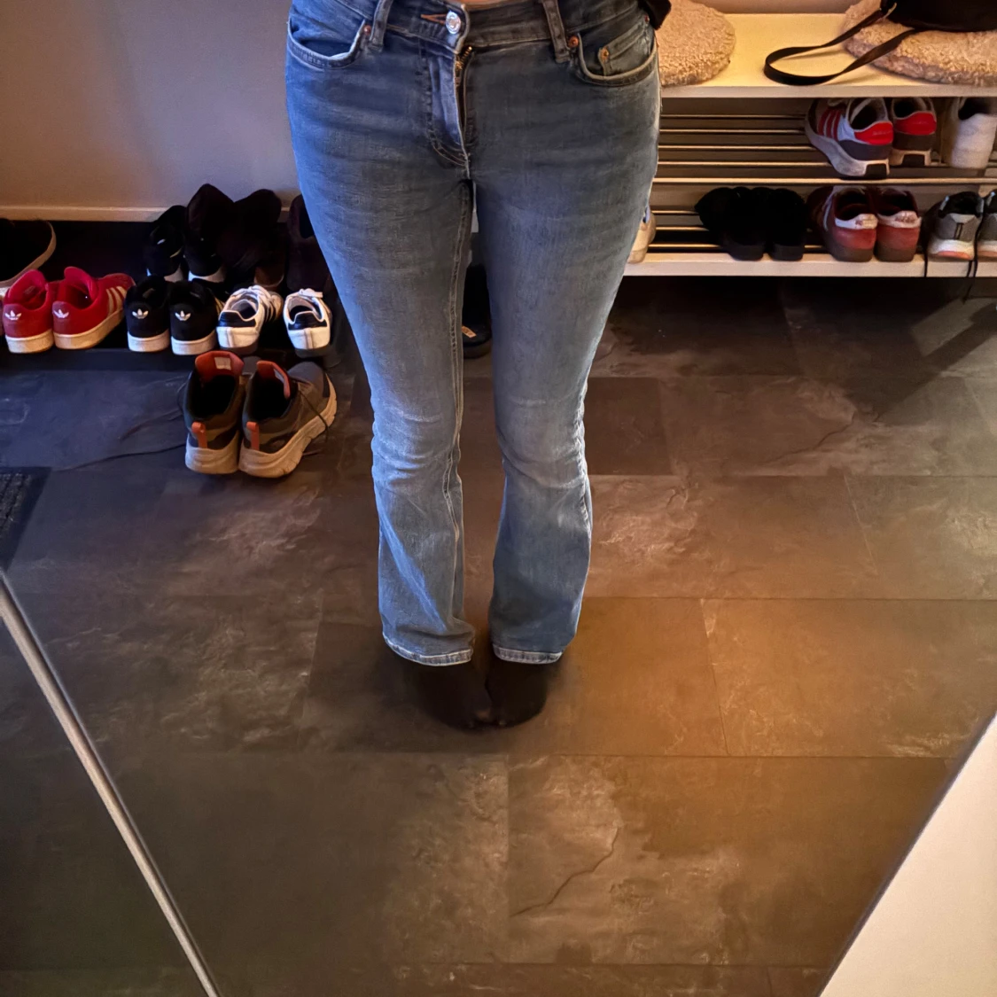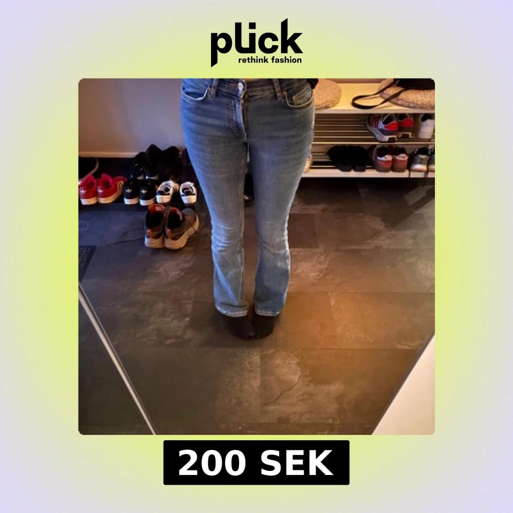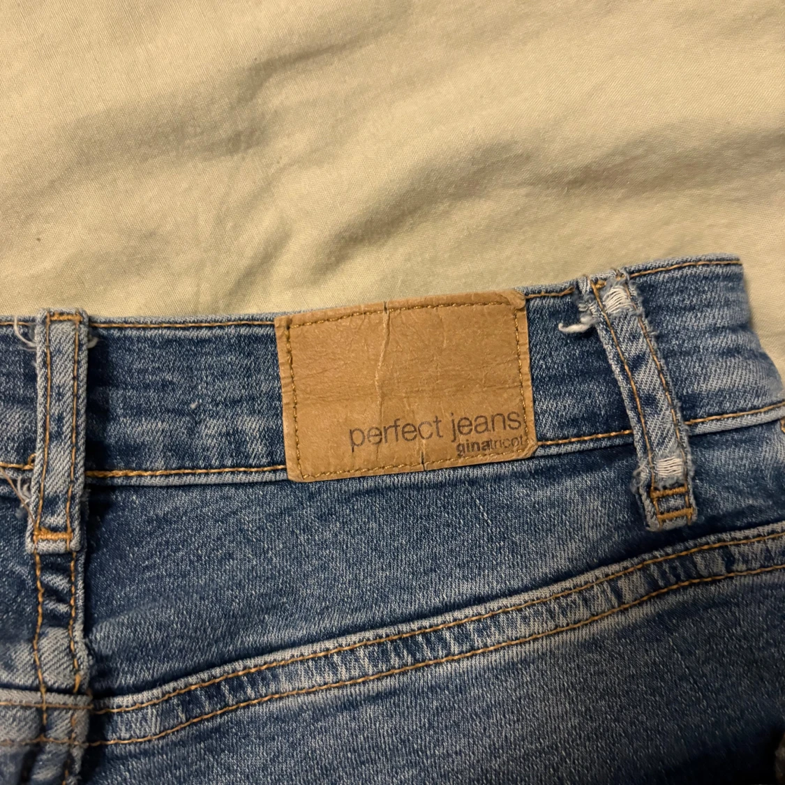 Säljer ett par ljusblå bootcut jeans från Gina Tricot, modell Perfect Jeans. De har medel hög midja och klassisk femficksdesign. Jeansen är i stretchigt denimtyg och sitter snyggt över höfterna innan de släpper ut vid bensluten.