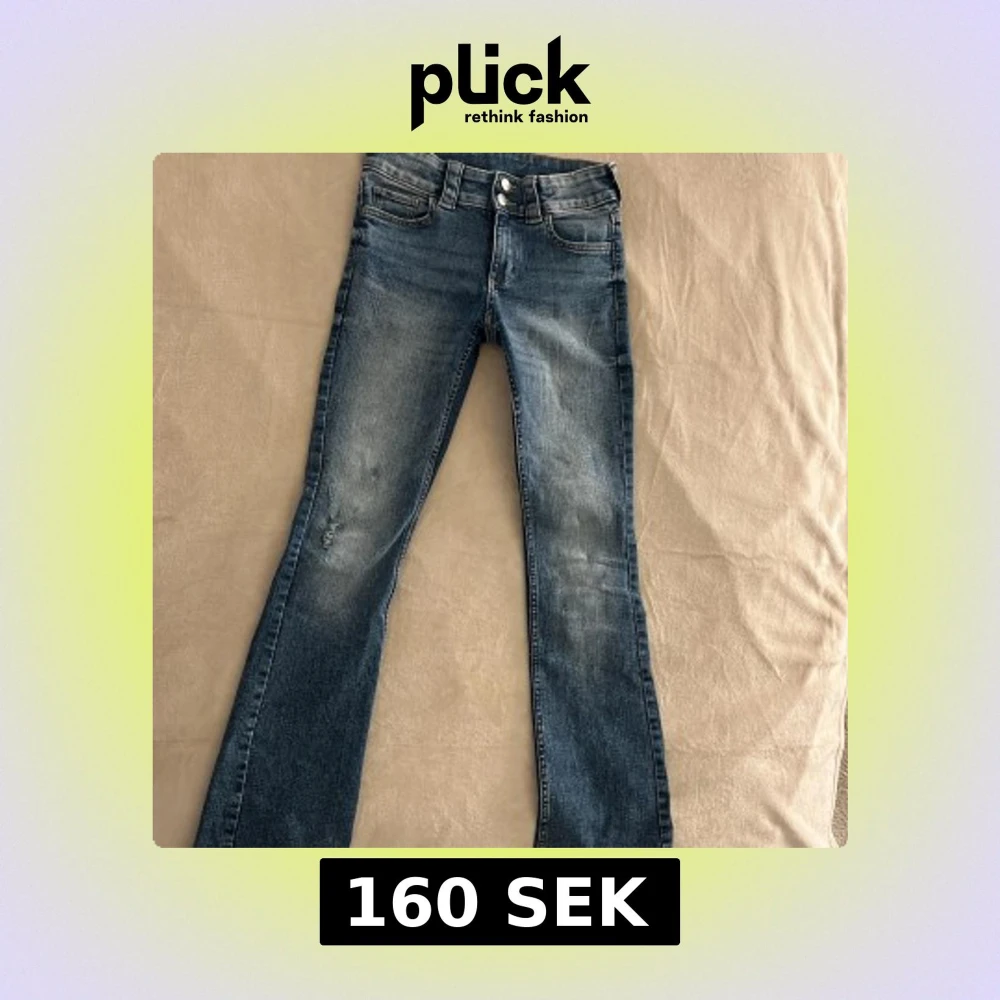 Säljer ett par blå lågmidjade bootcut jeans från H&M med justerbar midja. Jeansen är använda endast 2 gånger och är i bra skick.😊