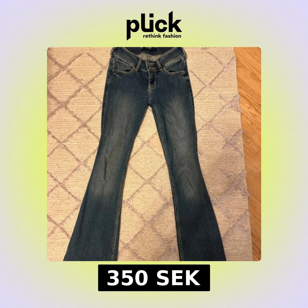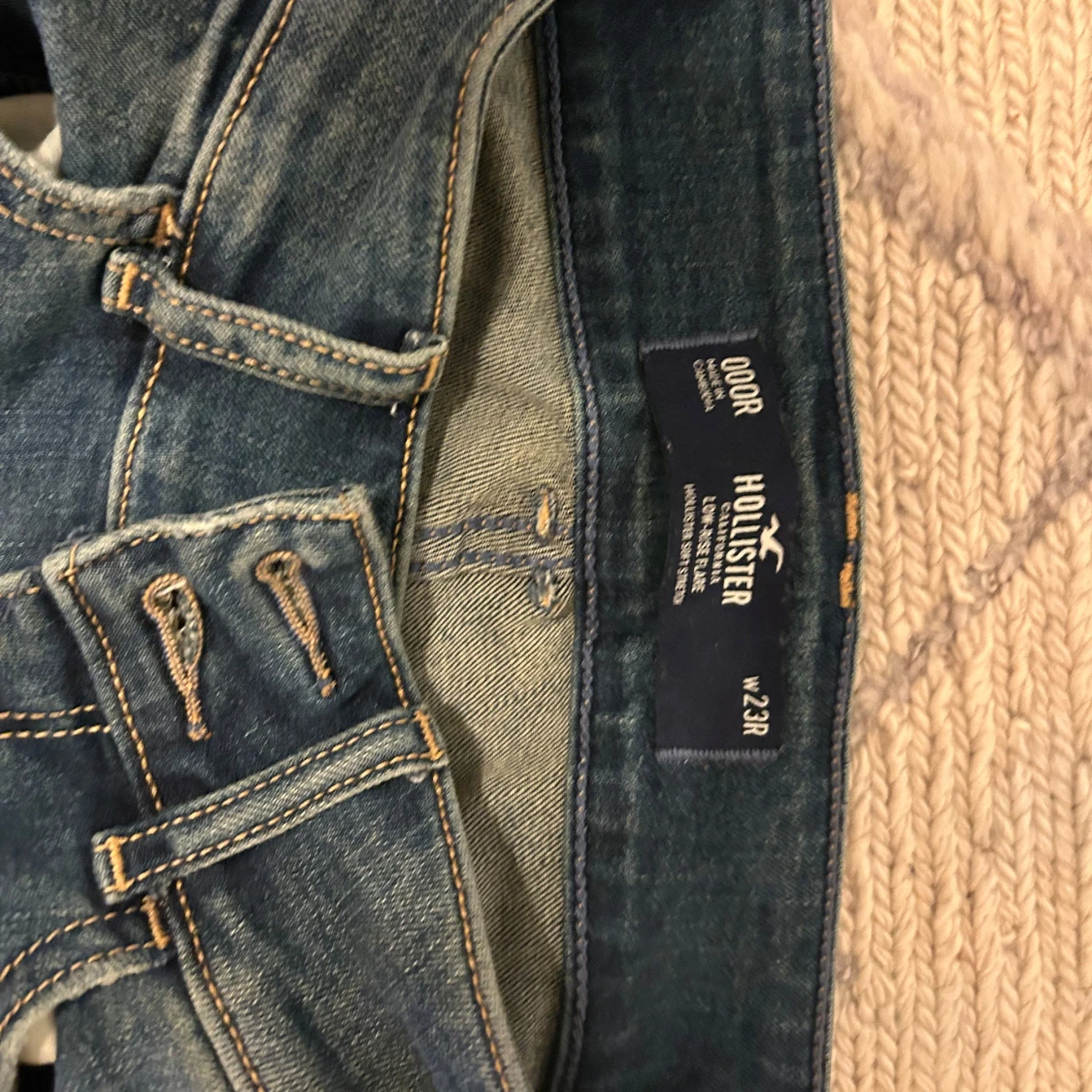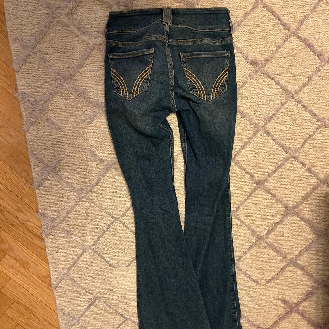 Snygga blå bootcut jeans från Hollister med coola broderade detaljer på bakfickorna. Jeansen har låg midja och är tillverkade i mjukt denim med lätt stretch. Midjemått:31cm Innerbenslängd:81cm