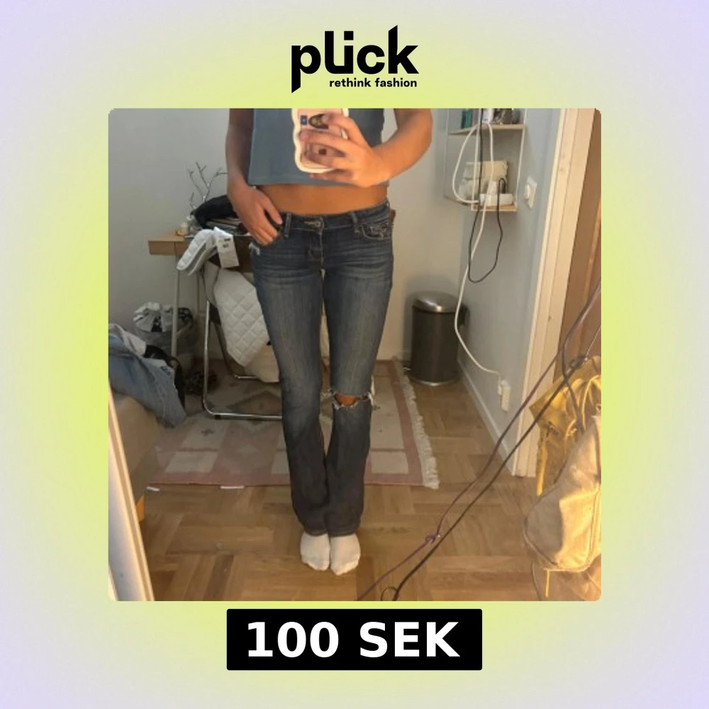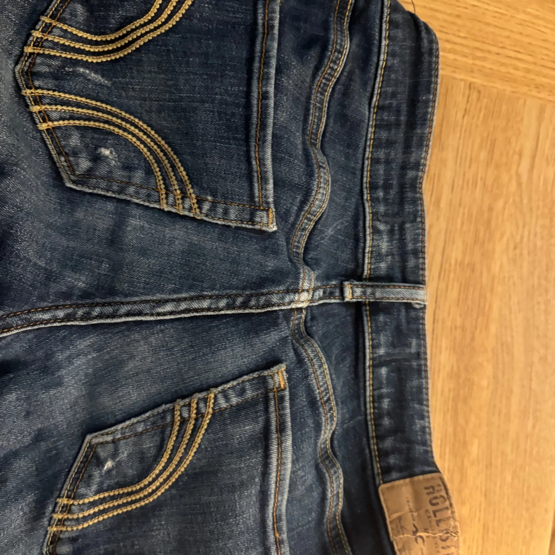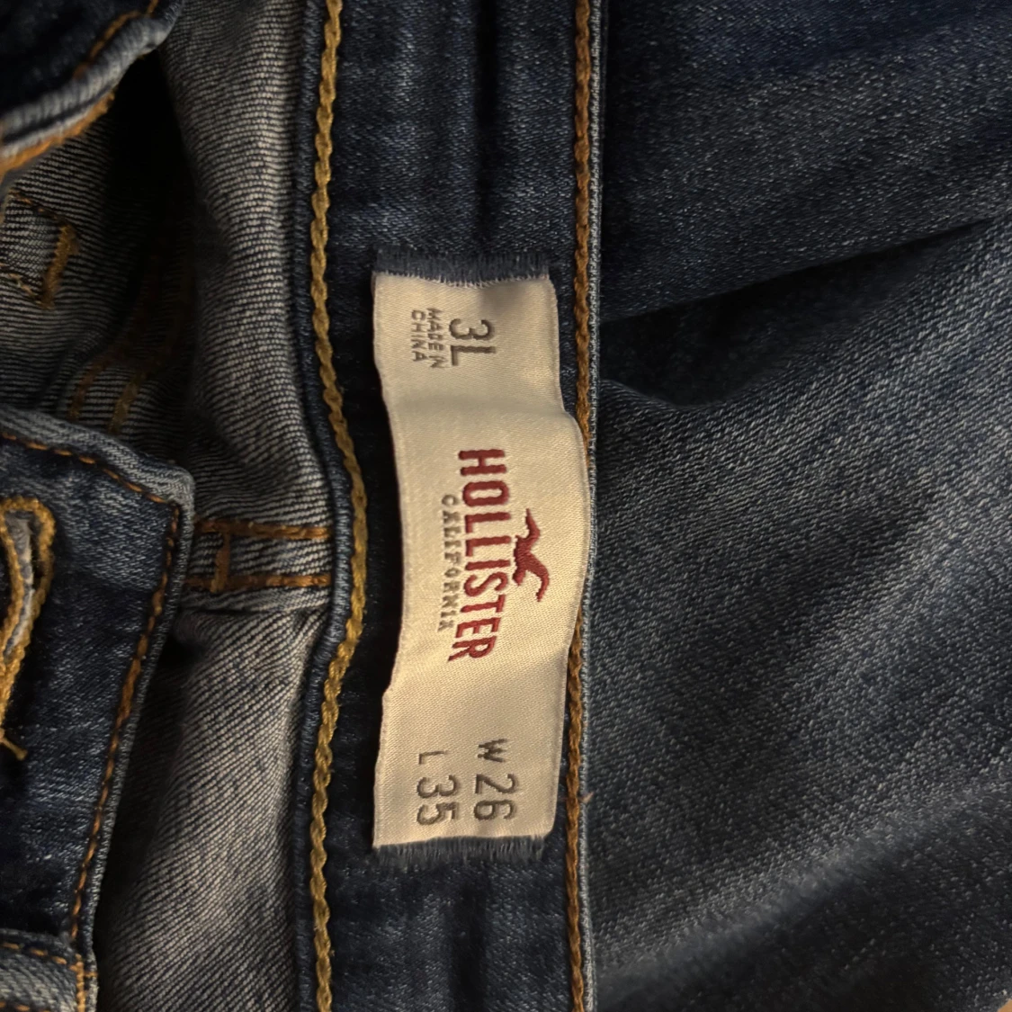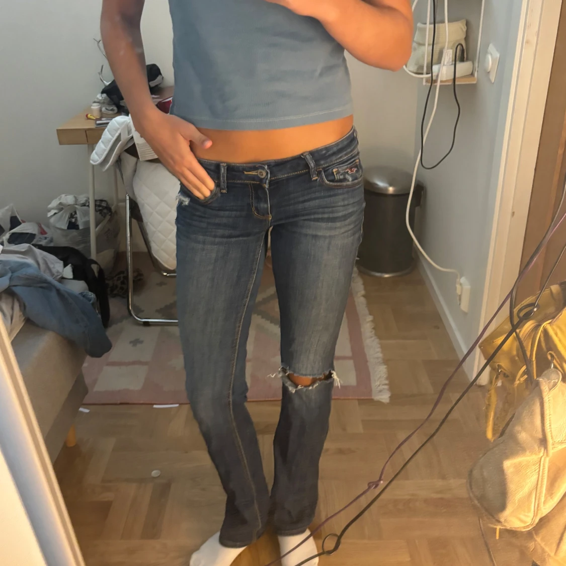 Säljer ett par snygga blå bootcut jeans från Hollister med låg midja och slitning vid ena knät. Klassiska detaljer med kontrastsömmar och femficksmodell. Jeansen är i stretchigt denim och har en riktigt schysst passform. Midjemått 34 innerbenslängd 82