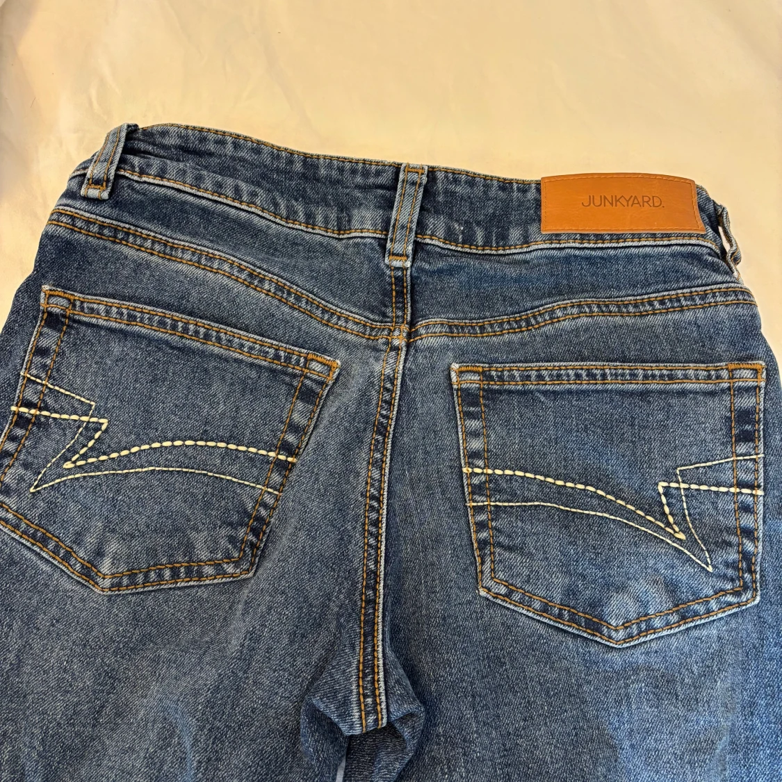 Snygga blå jeans från Junkyard med bootcut passform och coola kontrastsömmar på bakfickorna. Klassisk femficksmodell med bälteshällor och läderpatch bak i midjan. Perfekta för dig som gillar en avslappnad men trendig look.