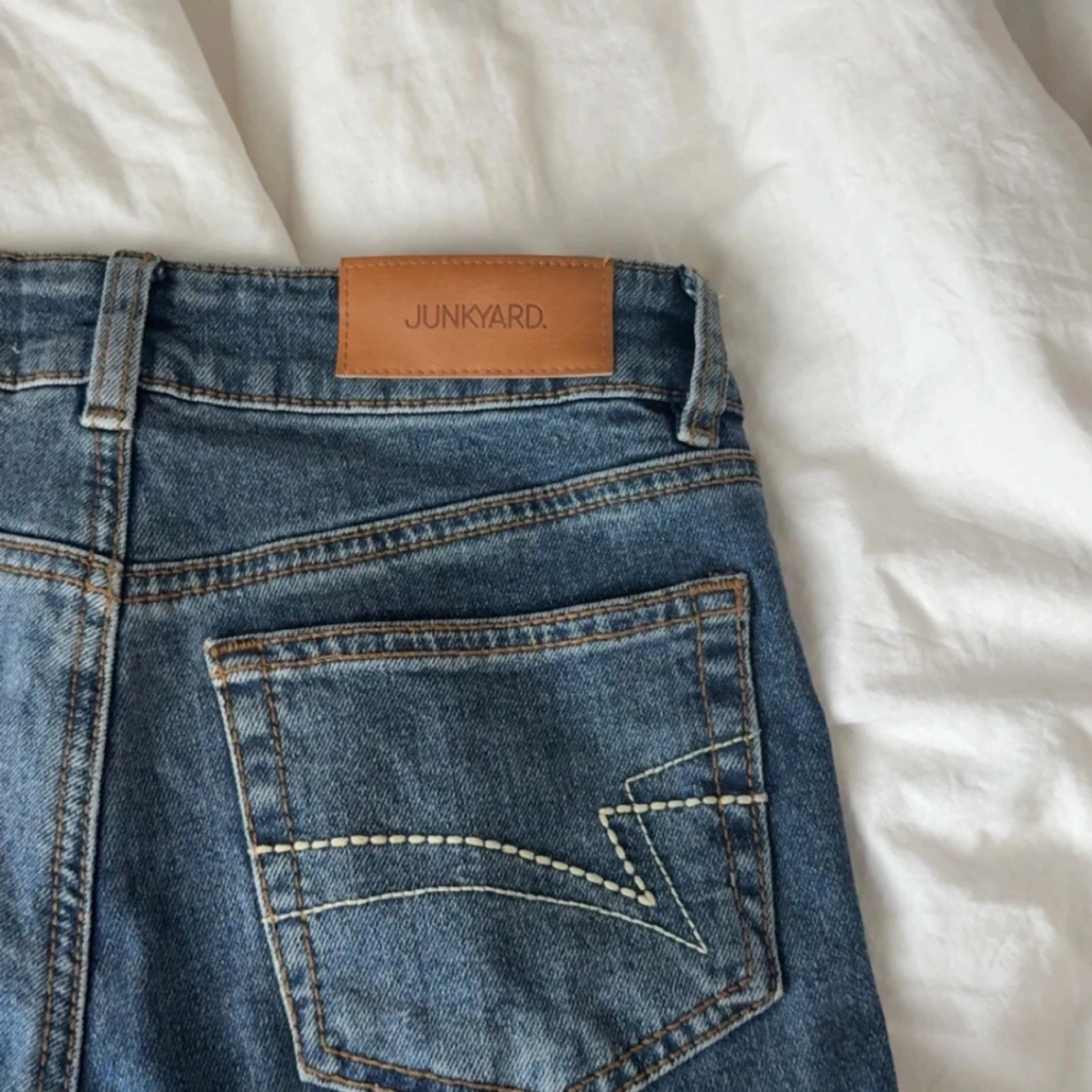 Snygga blå jeans från Junkyard i bootcut-modell med klassisk femficksdesign och coola kontrastsömmar. Jeansen har medel/låg midja och är tillverkade i slitstarkt denim med dragkedja och knapp framtill. Jeansen är använda fåtal gånger och är i storlek xs, dom är bra i längd för mig som är 170 cm lång.