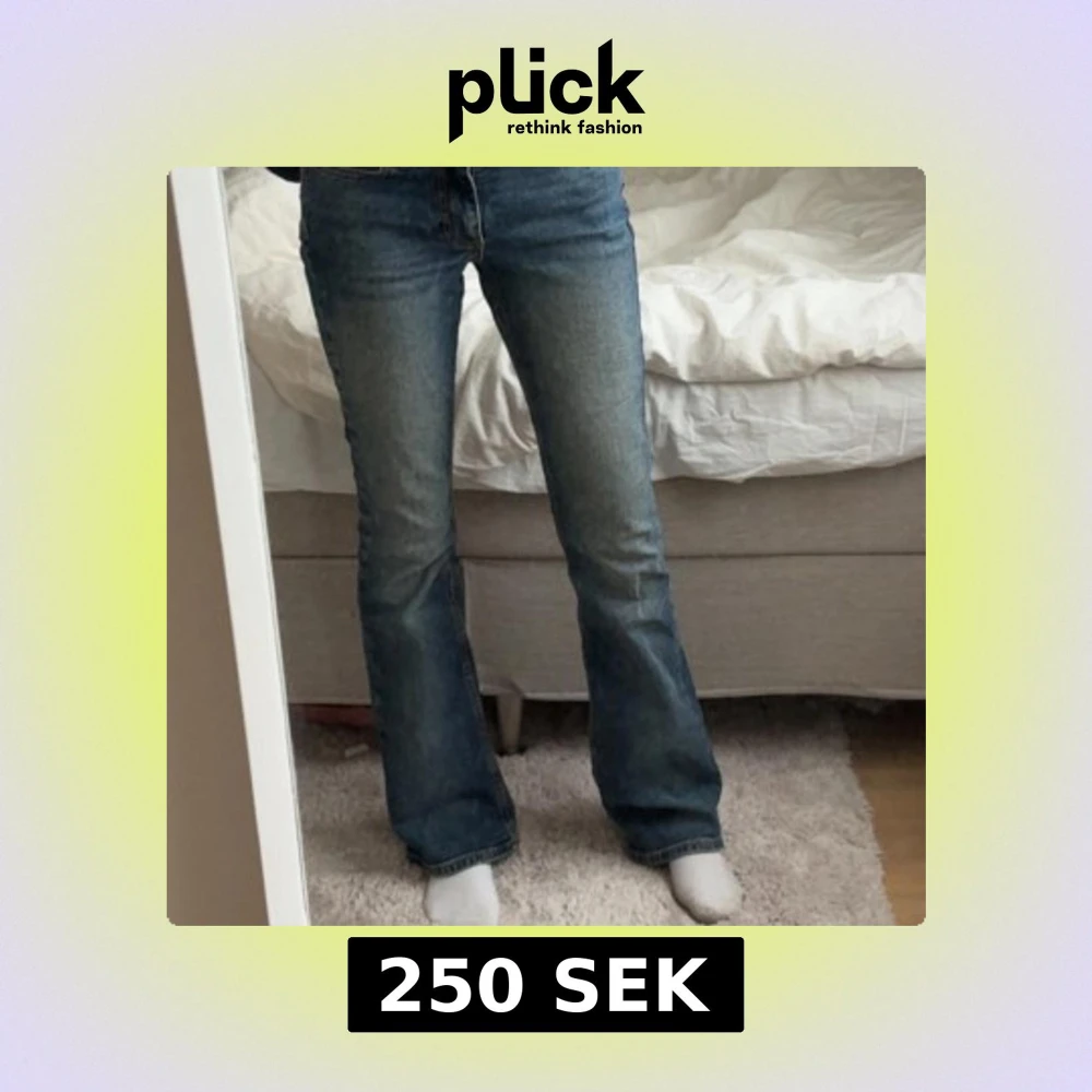 Snygga blå jeans från Junkyard i bootcut-modell med klassisk femficksdesign och coola kontrastsömmar. Jeansen har medel/låg midja och är tillverkade i slitstarkt denim med dragkedja och knapp framtill. Jeansen är använda fåtal gånger och är i storlek xs, dom är bra i längd för mig som är 170 cm lång.