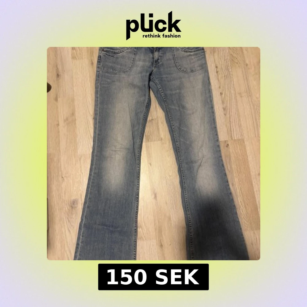 Säljer ett par klassiska blå bootcut jeans från Lee med snygga detaljer på bakfickorna och normal passform. Jeansen har låg midja och är tillverkade i ett mjukt denimtyg. Perfekta för dig som gillar retrostil och vill ha ett par bekväma jeans.
