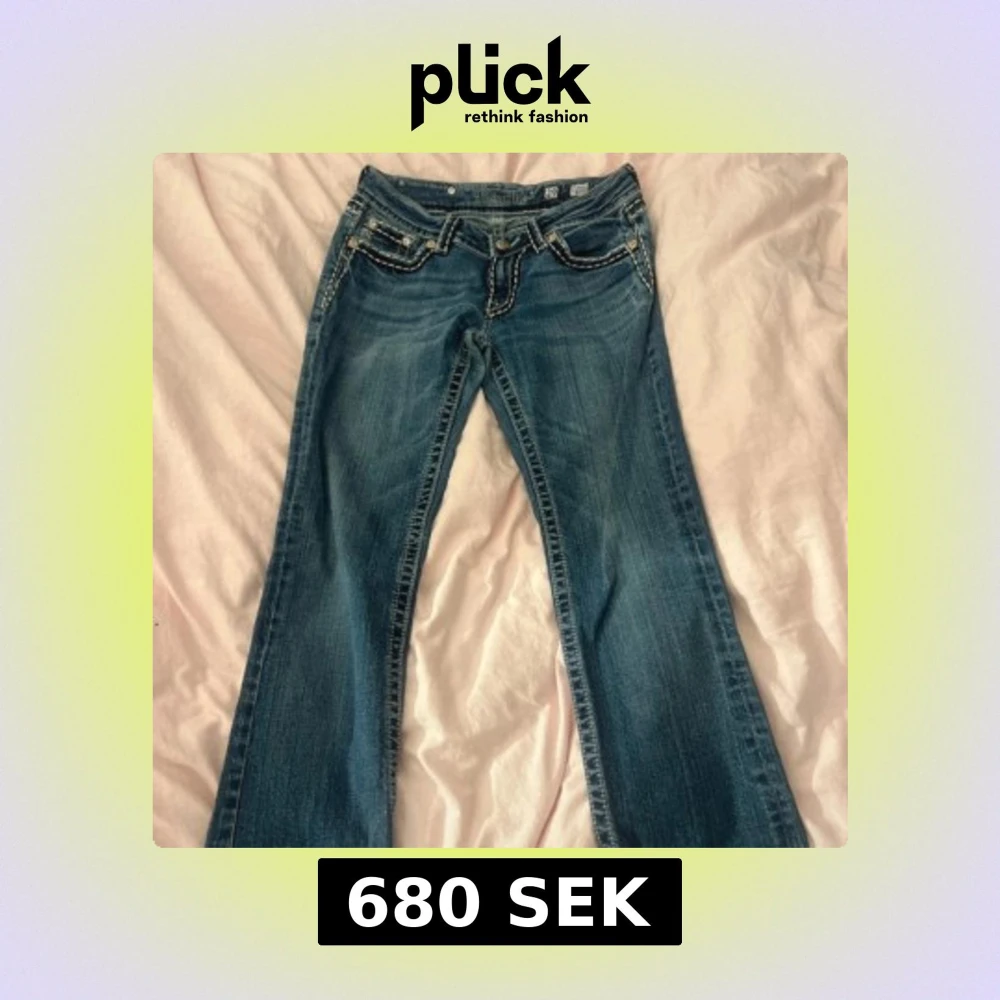 Snygga blå jeans från Miss Me med bootcut passform och låg midja. Jeansen har dekorativa vita sömmar, detaljerade fickor med nitar och broderier samt klassisk femficksdesign. Materialet är slitstarkt denim och de har coola knappar med mönster. Midjemått: 36-38cm Innebenslängd: 80cm