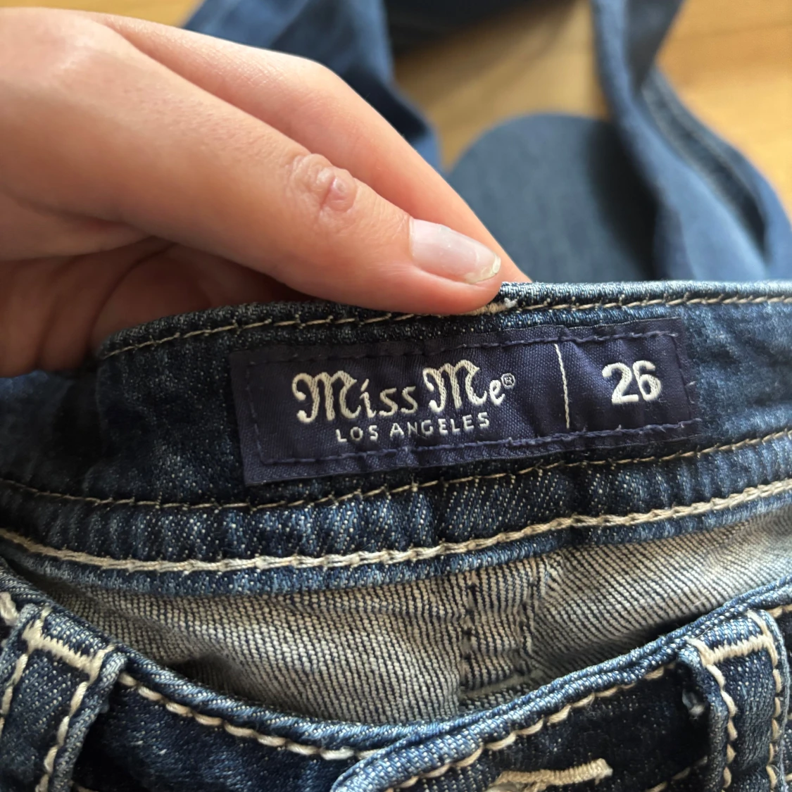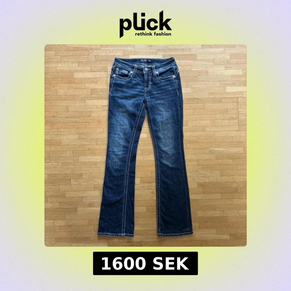 Snygga blå bootcut jeans från Miss Me med kontrastsömmar och detaljerade broderier på bakfickorna. Fickorna har coola vingar och stjärnor i silvertråd samt dekorativa knappar. Jeansen har klassisk femficksdesign och markerade sömmar för en extra edgy look. Köpta för ungefär 2200 kr.