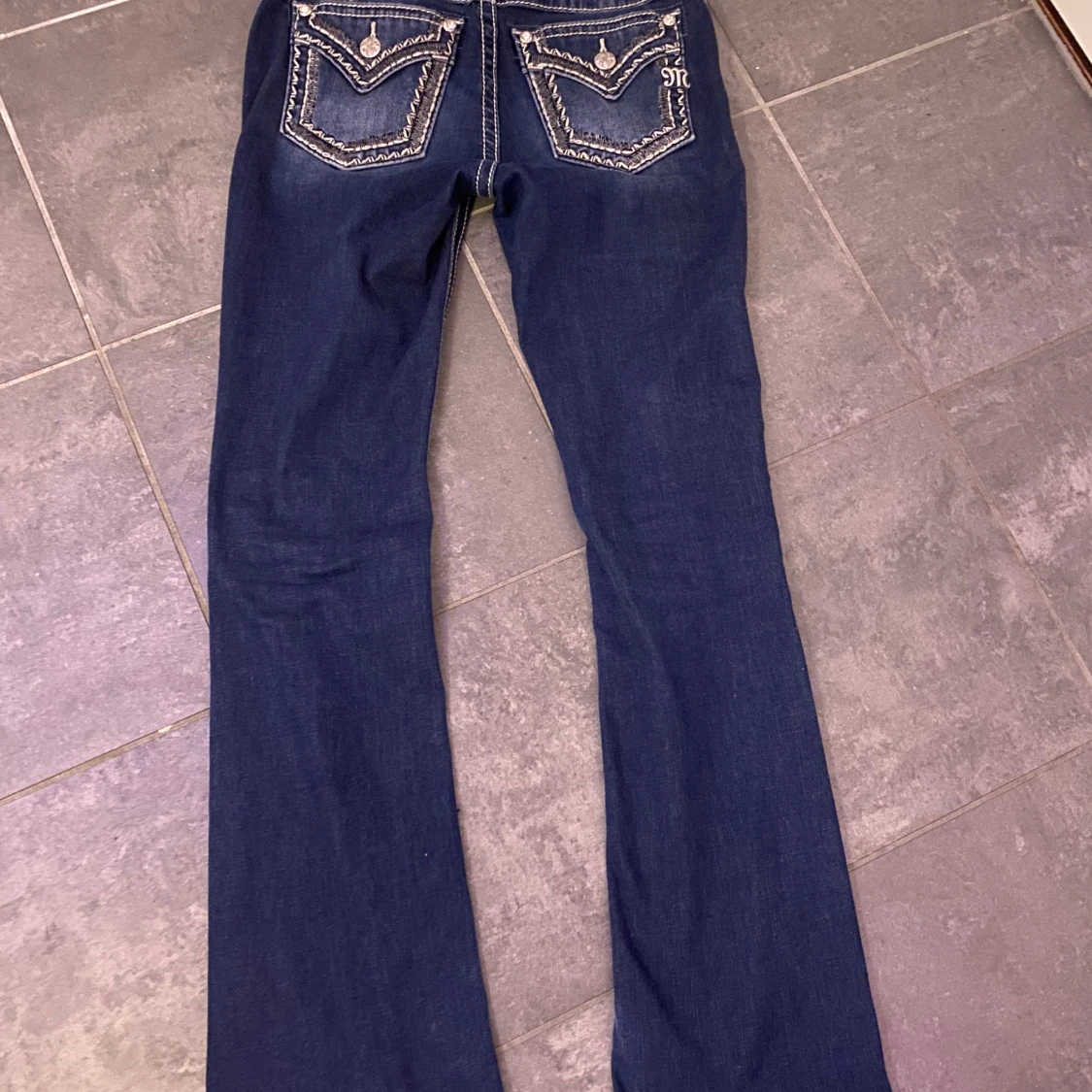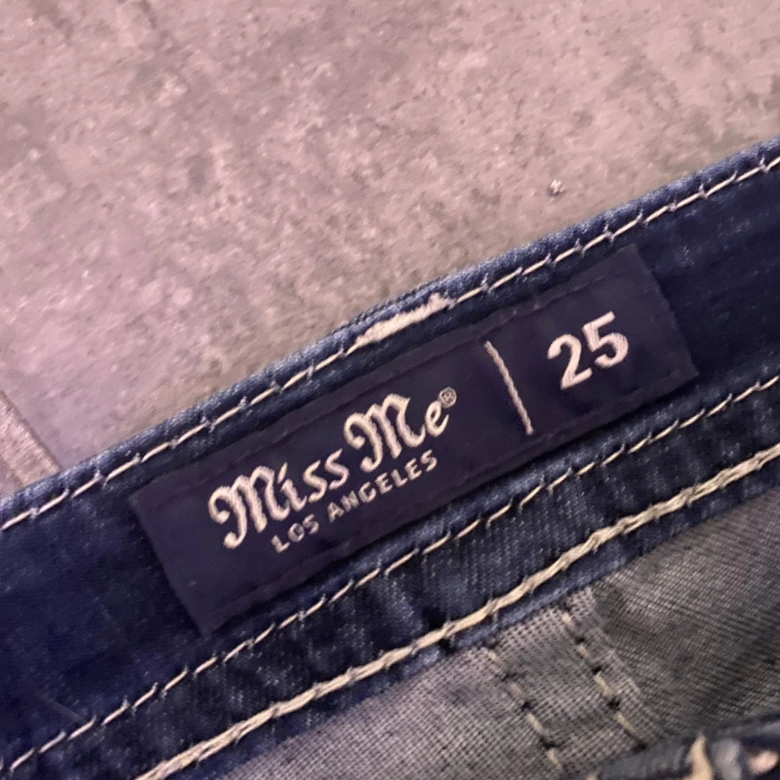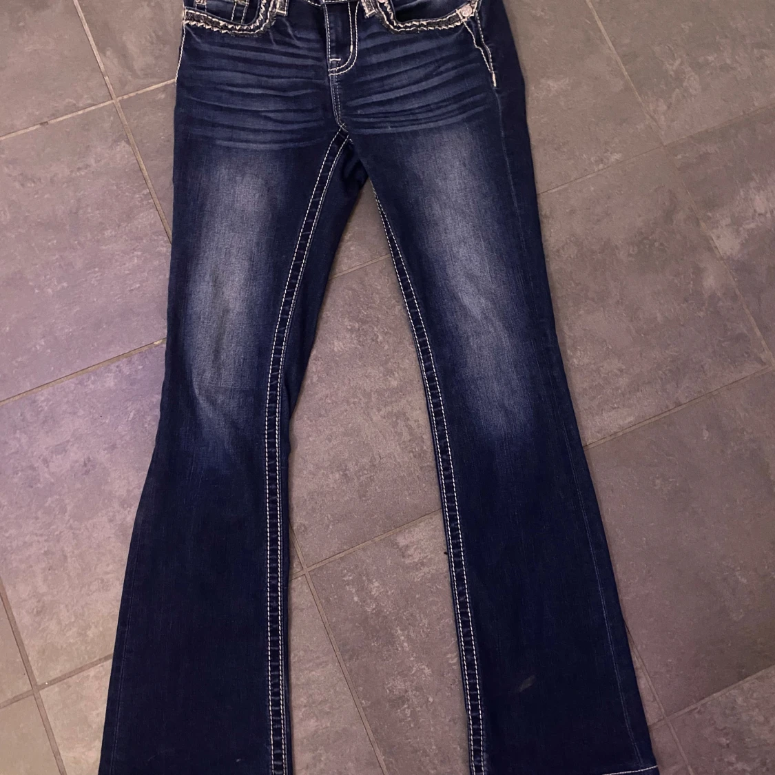 Snygga blå bootcut jeans från Miss Me med dekorativa bakfickor och kontrastsömmar. Perfekta för en avslappnad stil med en touch av detaljer. Midjan är låg och passformen är normal.