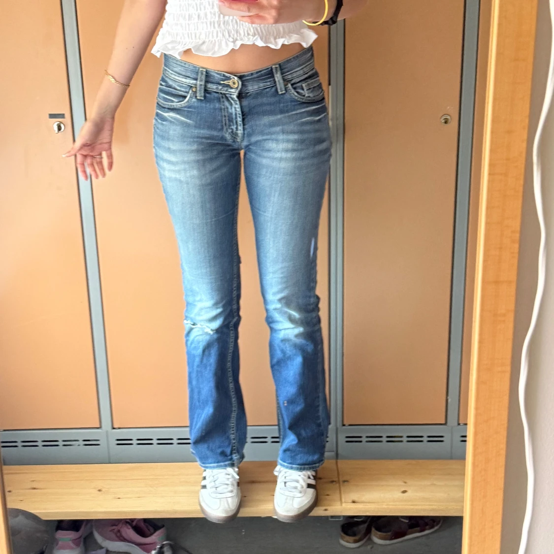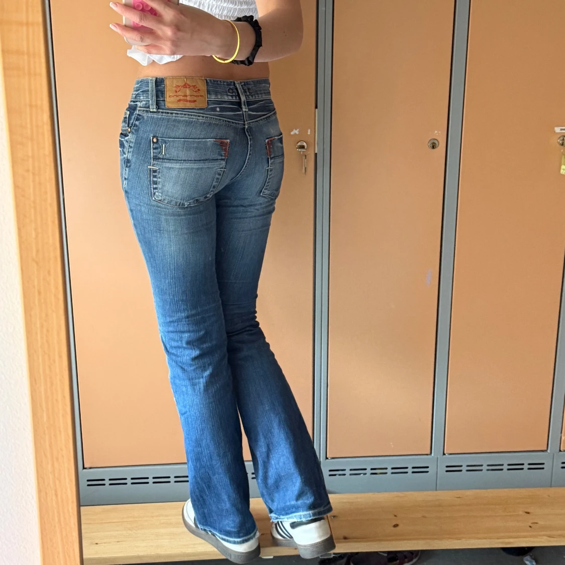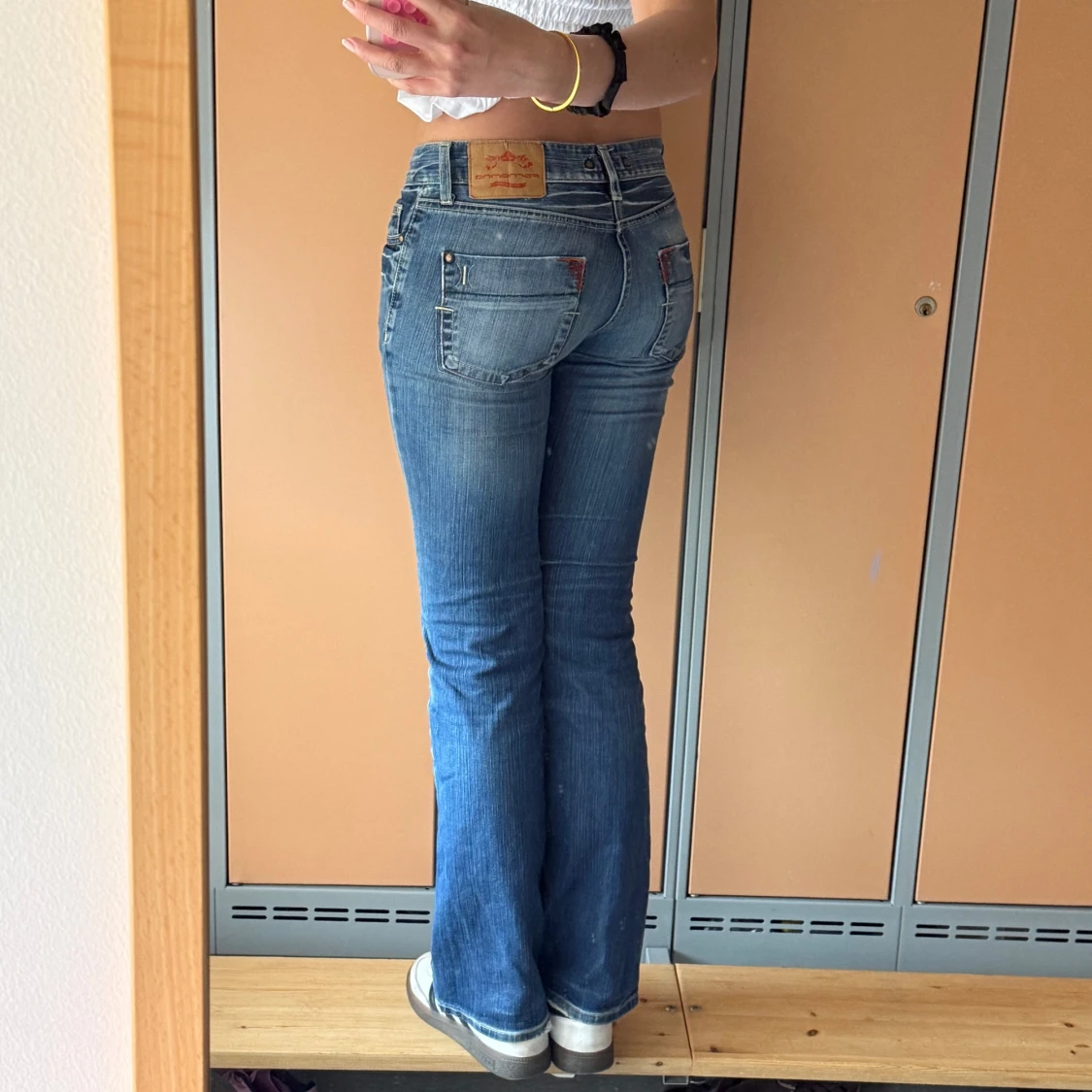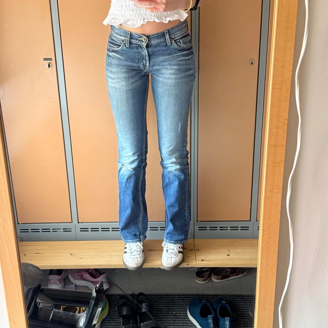 Snygga blå jeans från Miss Sixty med låg midja och bootcut-ben. Jeansen har klassiska fem fickor, slitningar och ljus tvätt för en cool vintagekänsla. Materialet är mjukt denim i bomull med lite stretch för skön passform.