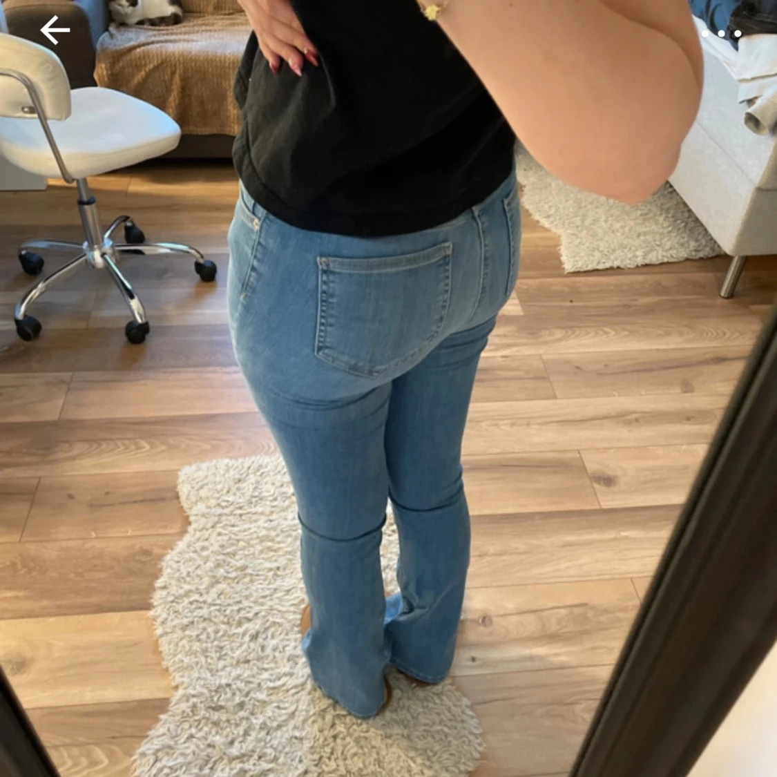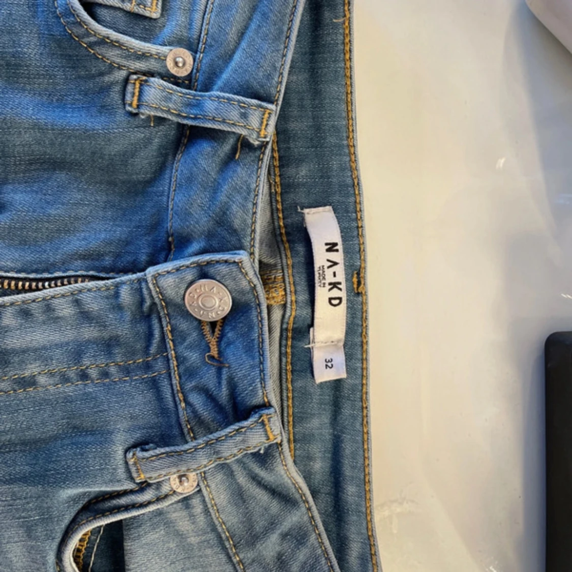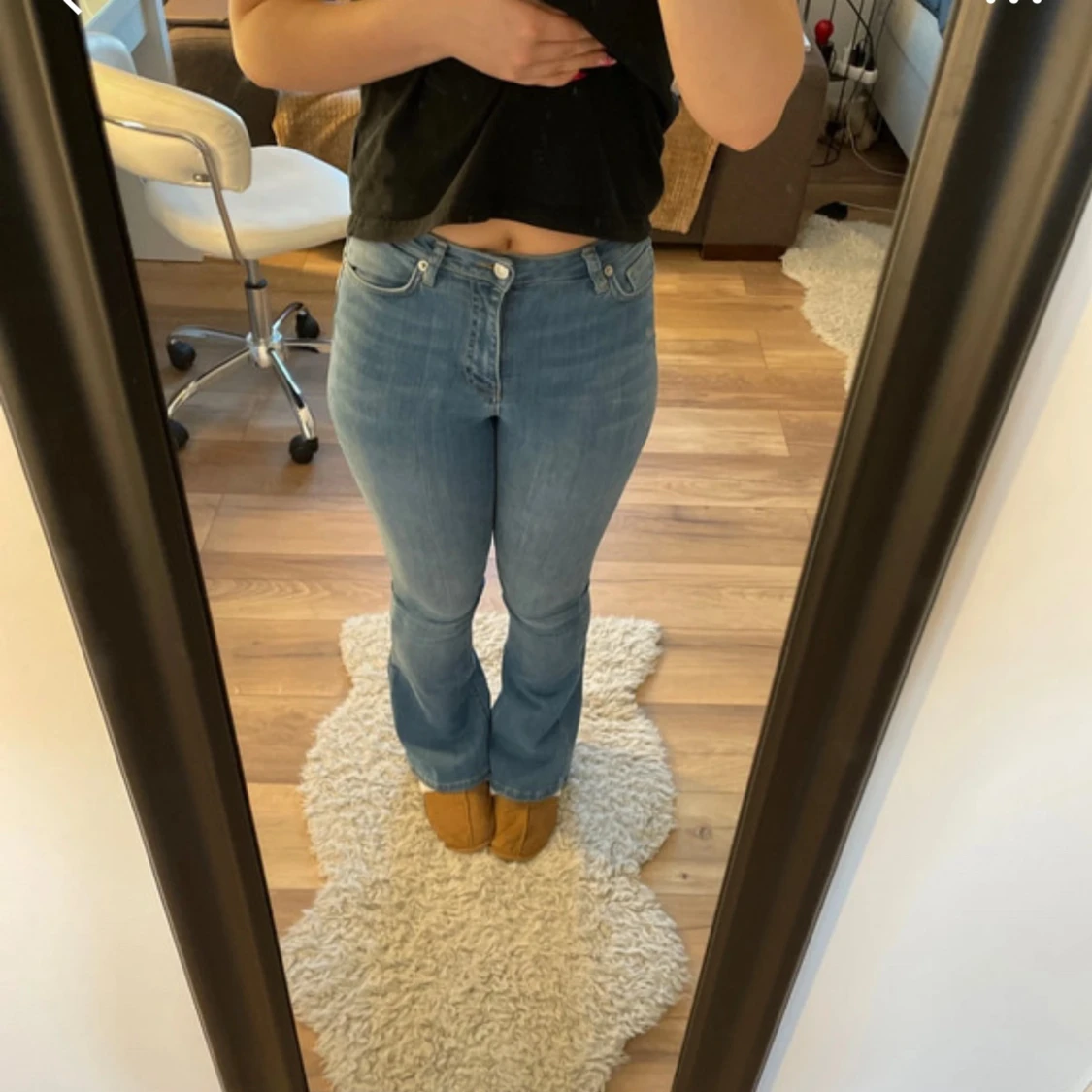 Säljer ett par klassiska blå bootcut jeans från NA-KD. Jeansen har normal passform, hög midja och stängs med dragkedja och knapp. Perfekta för dig som gillar en tidlös stil med lite utsvängda ben.