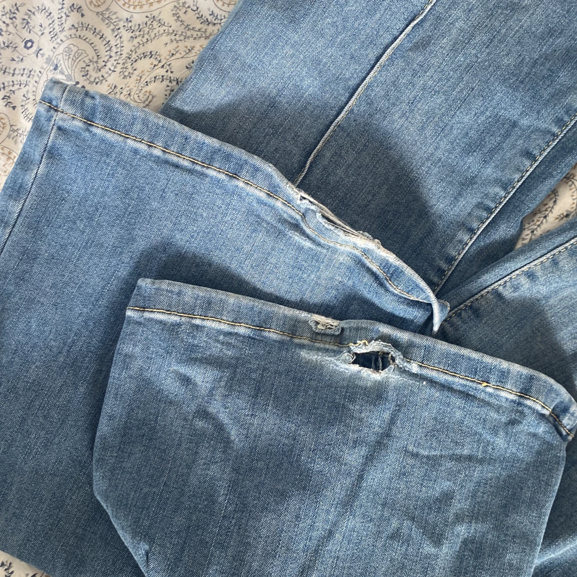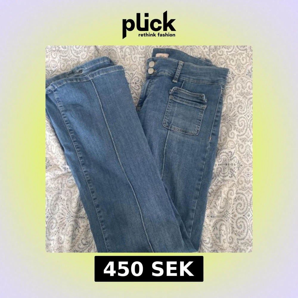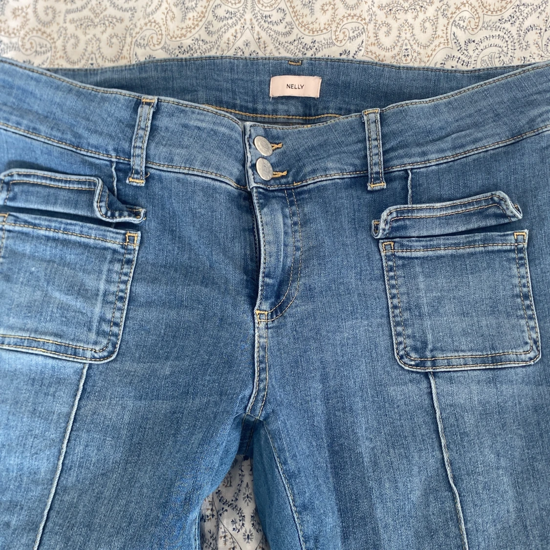 Snygga blå bootcut jeans från Nelly med låg midja och dubbla knappar. Jeansen har framträdande fickor och en linje på som design. Lite slitna på slutet av byxorna. Original pris 699 men säljer för 450kr.