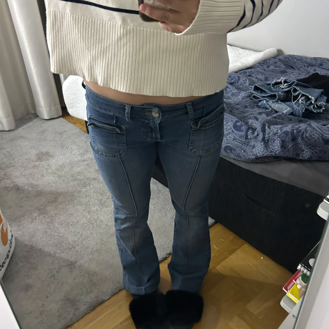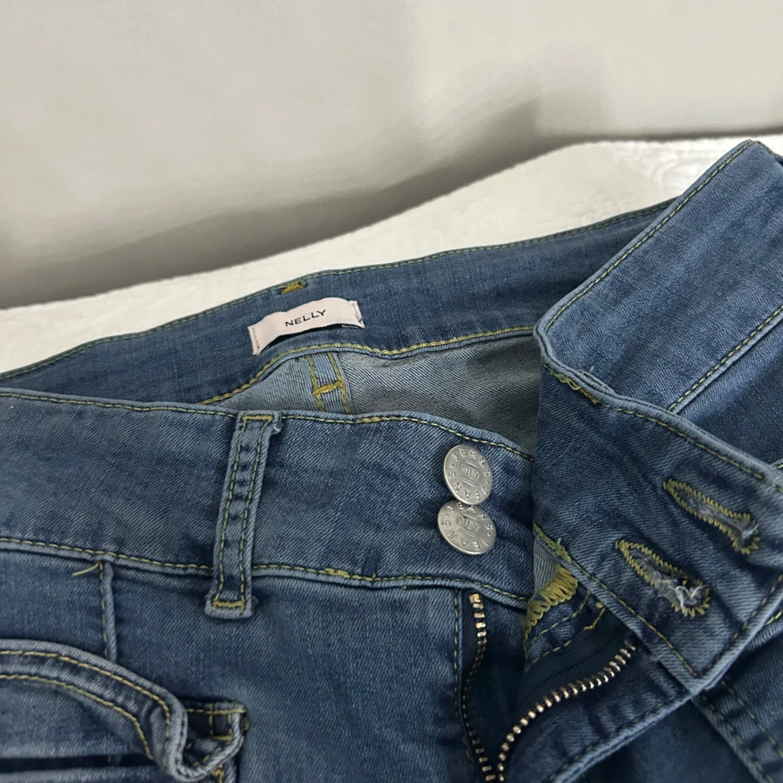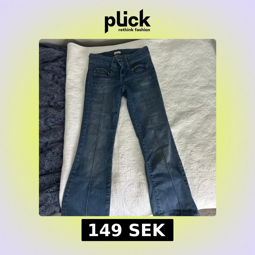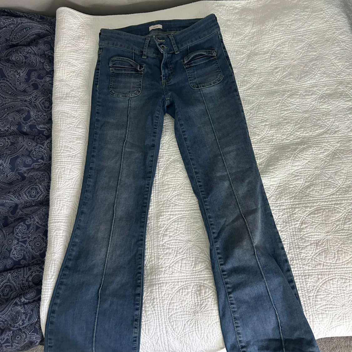 Snygga blå jeans från Nelly med bootcut-modell och låg midja. Jeansen har markerade sömmar längs benen, dubbla framfickor med dragkedjedetaljer och klassiska bakfickor. Perfekta för dig som gillar en retro vibe och vill ha något som sticker ut. Jag är inte säker men tror den är i storlek 36, den är iaf för 152 cm.
