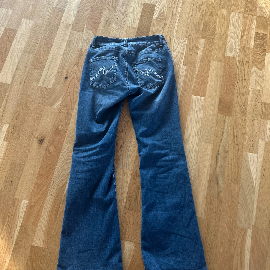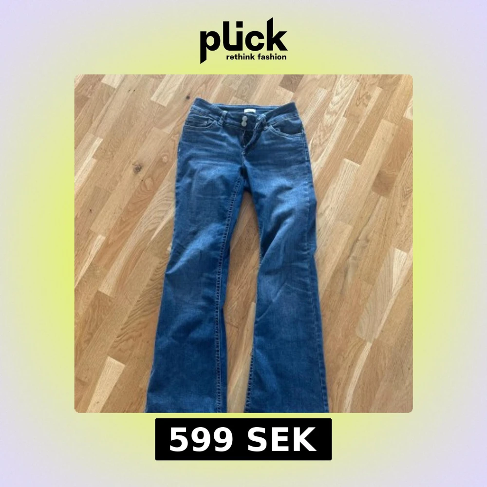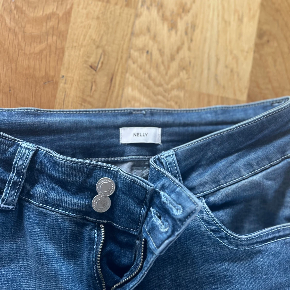 Snygga blå bootcut jeans från Nelly med klassisk femficksdesign och dubbla silverknappar i midjan. Jeansen har broderade detaljer på bakfickorna och är tillverkade i mjukt denimtyg med lätt stretch för skön passform.