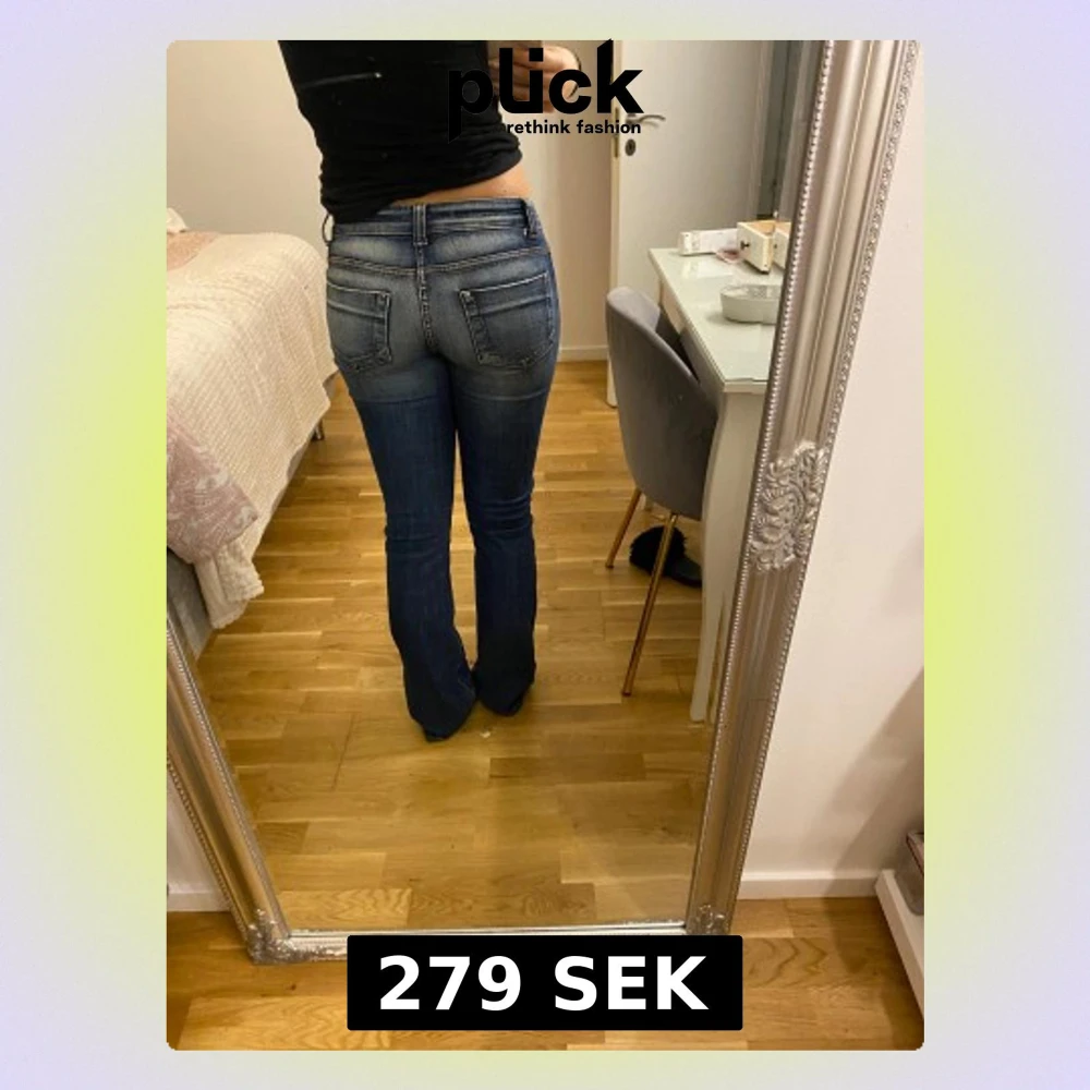 Säljer ett par snygga blå jeans från only med bootcut-snitt och låg midja. Jeansen har klassiska fickor både fram och bak, samt tydliga slitningar och tvättade detaljer för en cool look. Materialet är jeans med stretch för skön passform. Lågmidjade