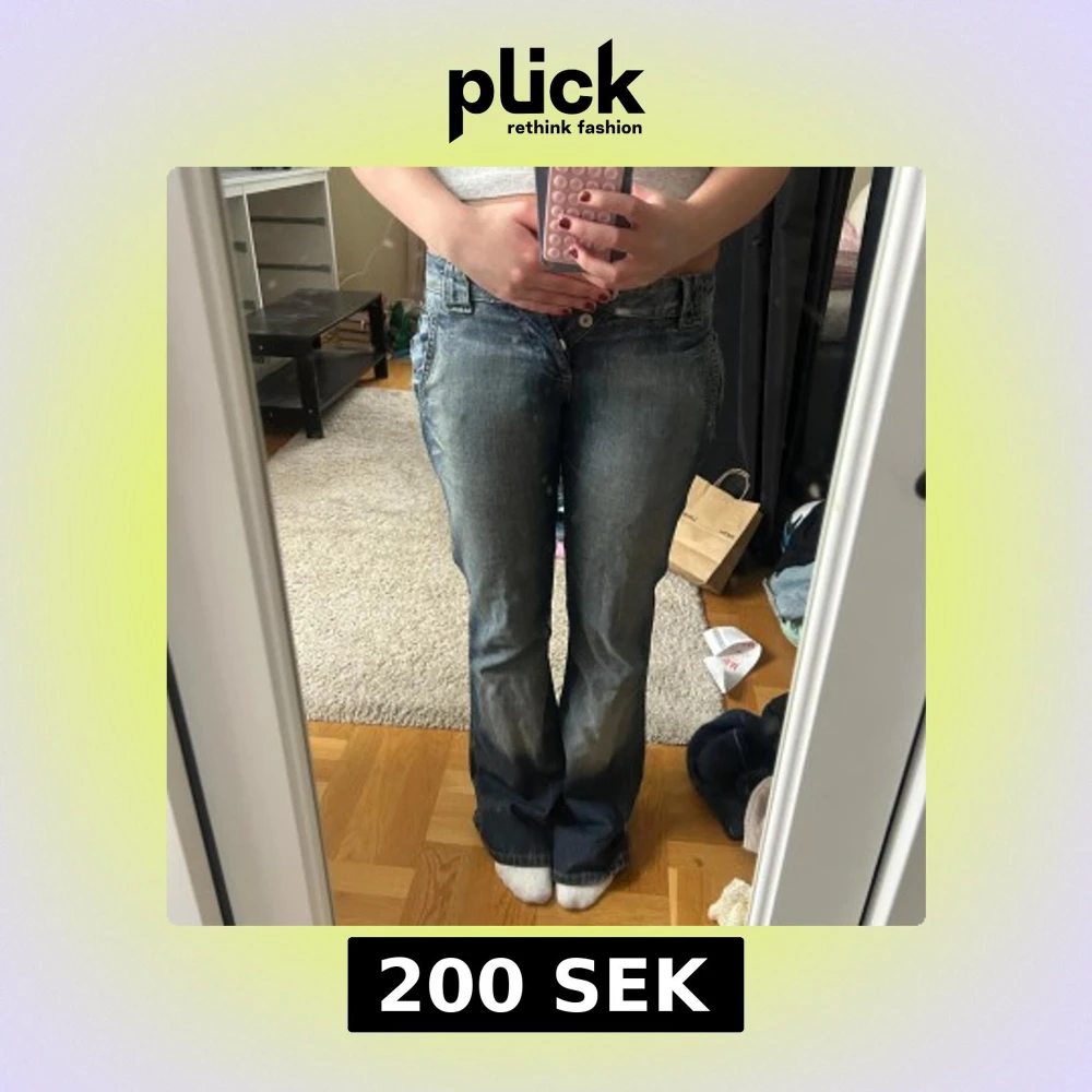 Säljer ett par blå bootcut jeans från Reactive med snygg slitning och dubbla knappar i midjan. Tyvärr för små för mig, strl W27 L32