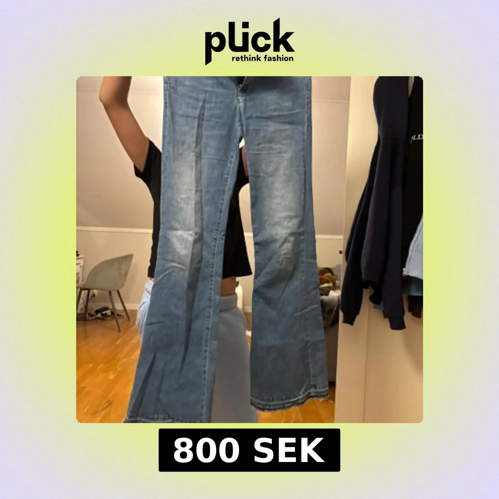 Säljer ett par ljusblå bootcut jeans från Replay med klassisk femficksdesign och broderad logga vid fickan. Jeansen har en snygg tvätt och raka, något utsvängda ben. Perfekta för dig som gillar en avslappnad men trendig look. Nypris 1300 kr.