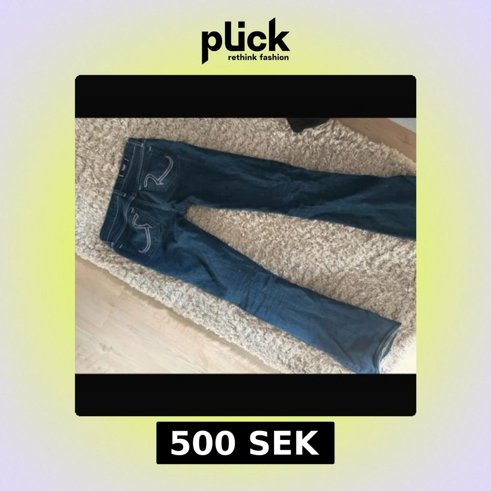 Säljer ett par klassiska blå bootcut jeans från rock and republic med snygga broderade bakfickor i lila och vitt. Jeansen har normal passform och är tillverkade i jeansmaterial. Perfekta för dig som gillar en tidlös stil.