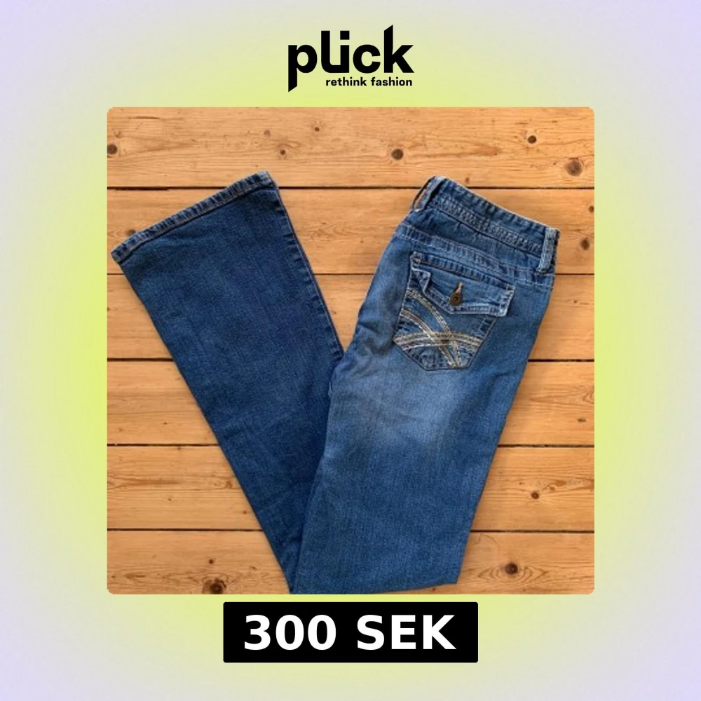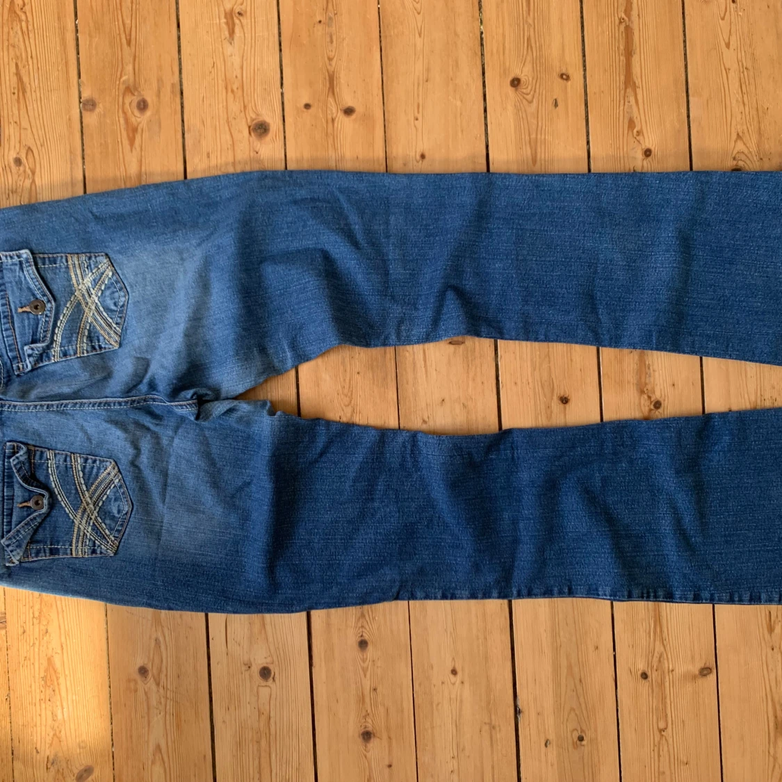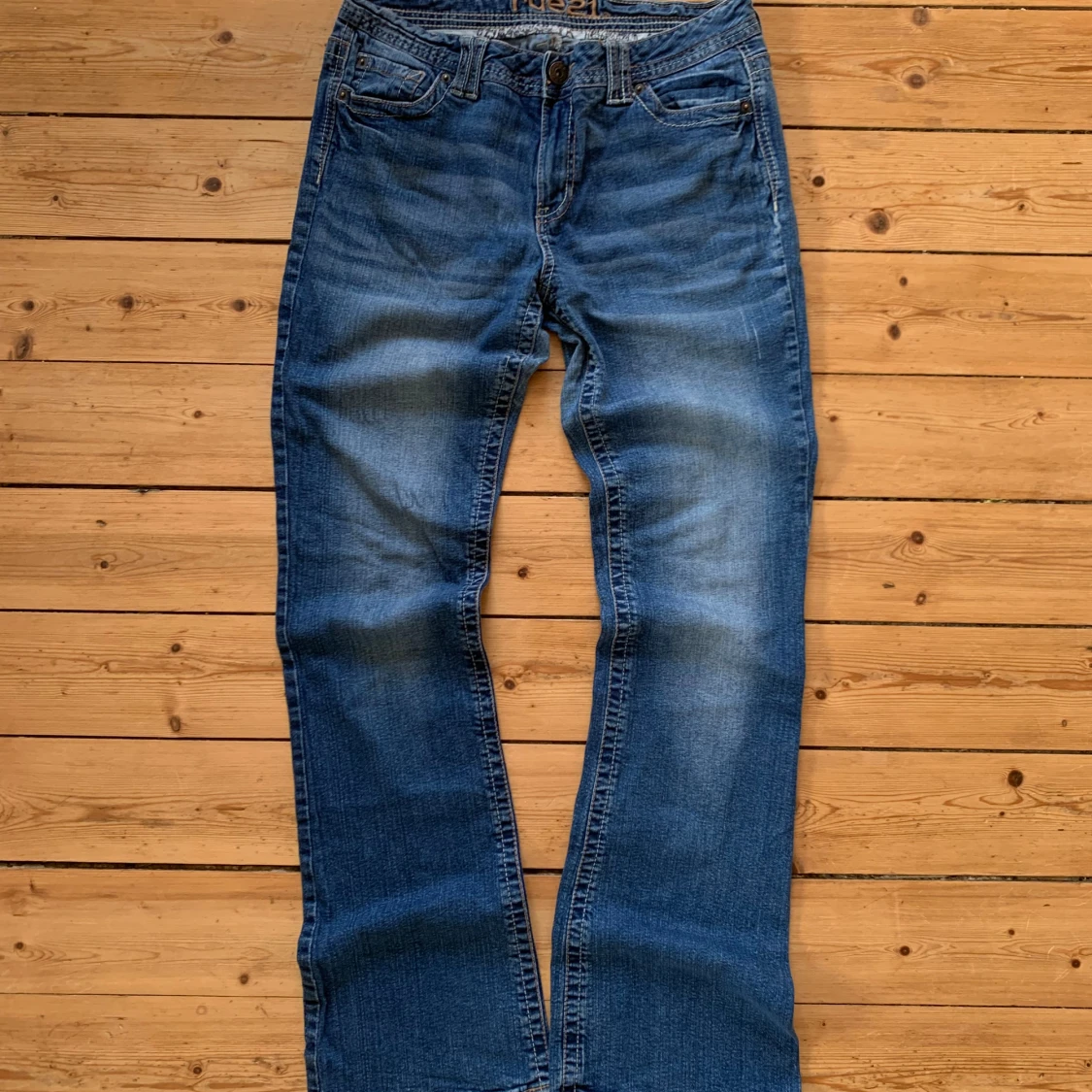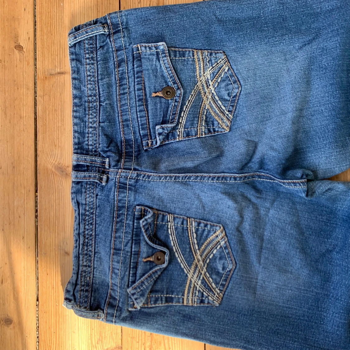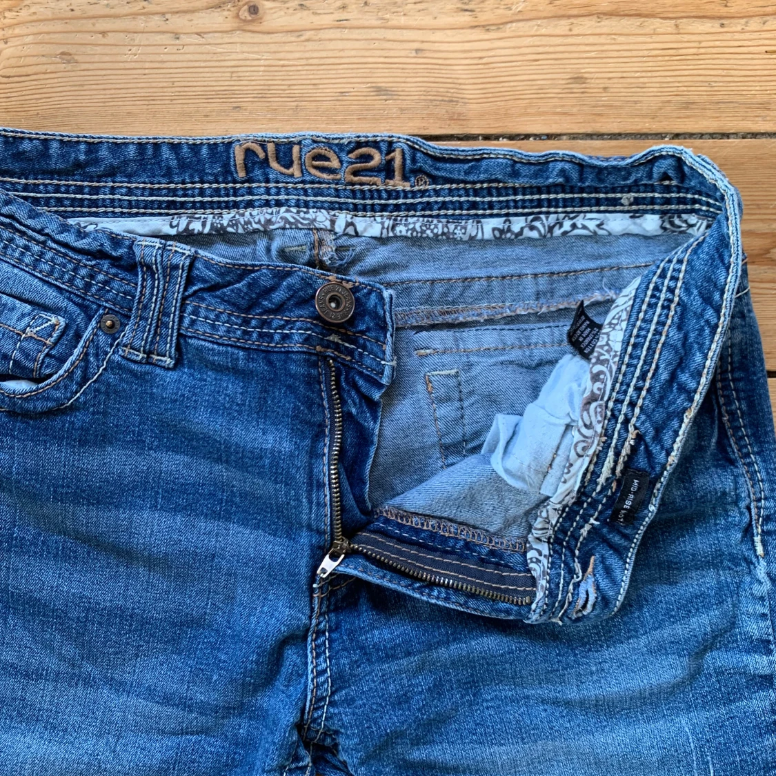 Snygga blå jeans från rue21 med bootcut passform och klassisk femficksdesign. Bakfickorna har dekorativa sömmar och knappdetalj. Jeansen har dragkedja och knapp framtill samt coolt mönstrat innerfoder i midjan. Perfekta för en avslappnad och trendig look. Storlek W32 L32