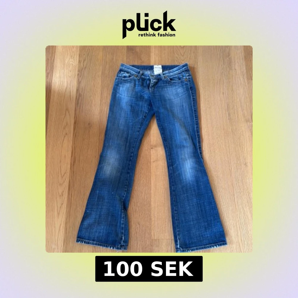 Säljer ett par klassiska blå bootcut jeans från Take Two med snygga slitningar och ljusare partier framtill. Jeansen har fem fickor och orangea sömmar. Perfekta för dig som gillar en retrostil med utsvängda ben.