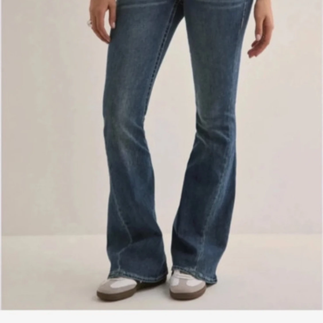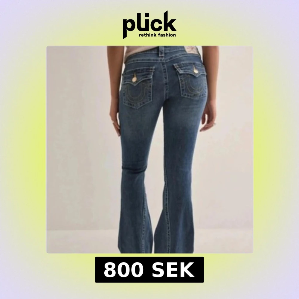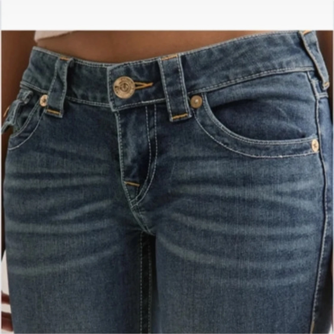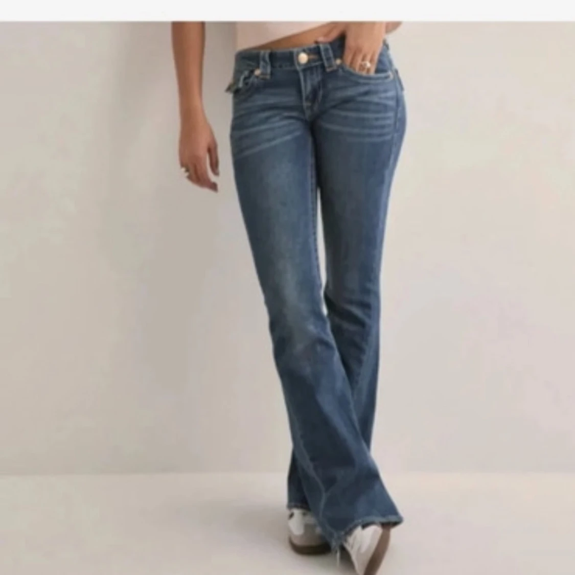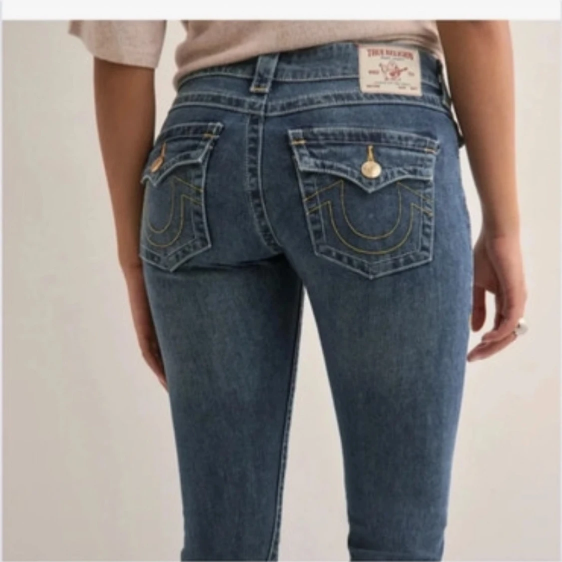 Snygga blå bootcut jeans från True Religion med klassiska kontrastsömmar och guldiga knappar på bakfickorna. Jeansen har låg midja och är tillverkade i jeansmaterial med en lätt utsvängd passform nertill. Perfekta för dig som gillar en retroinspirerad look. Aldrig använda, storlek 27💕