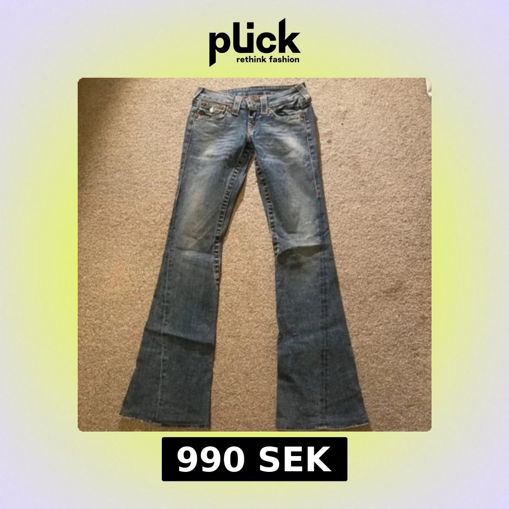 Snygga blå bootcut jeans från True Religion med ikoniska bakfickor och dekorativa sömmar. Jeansen har en klassisk femficksdesign och knappar med logotyp. Perfekta för en avslappnad stil med en touch av retro. Storleken i byxorna är 24.