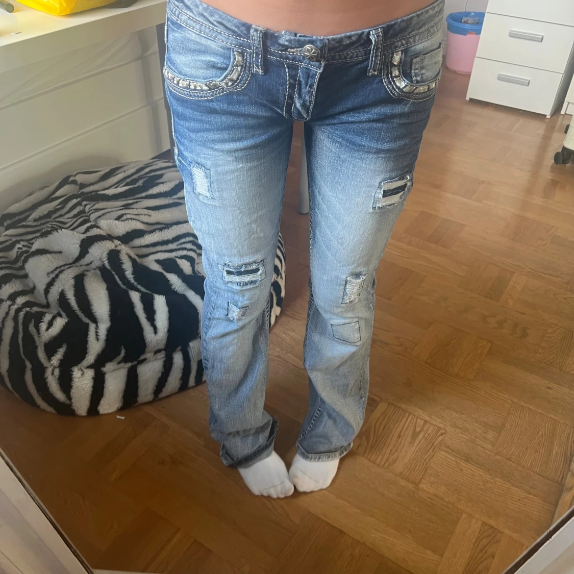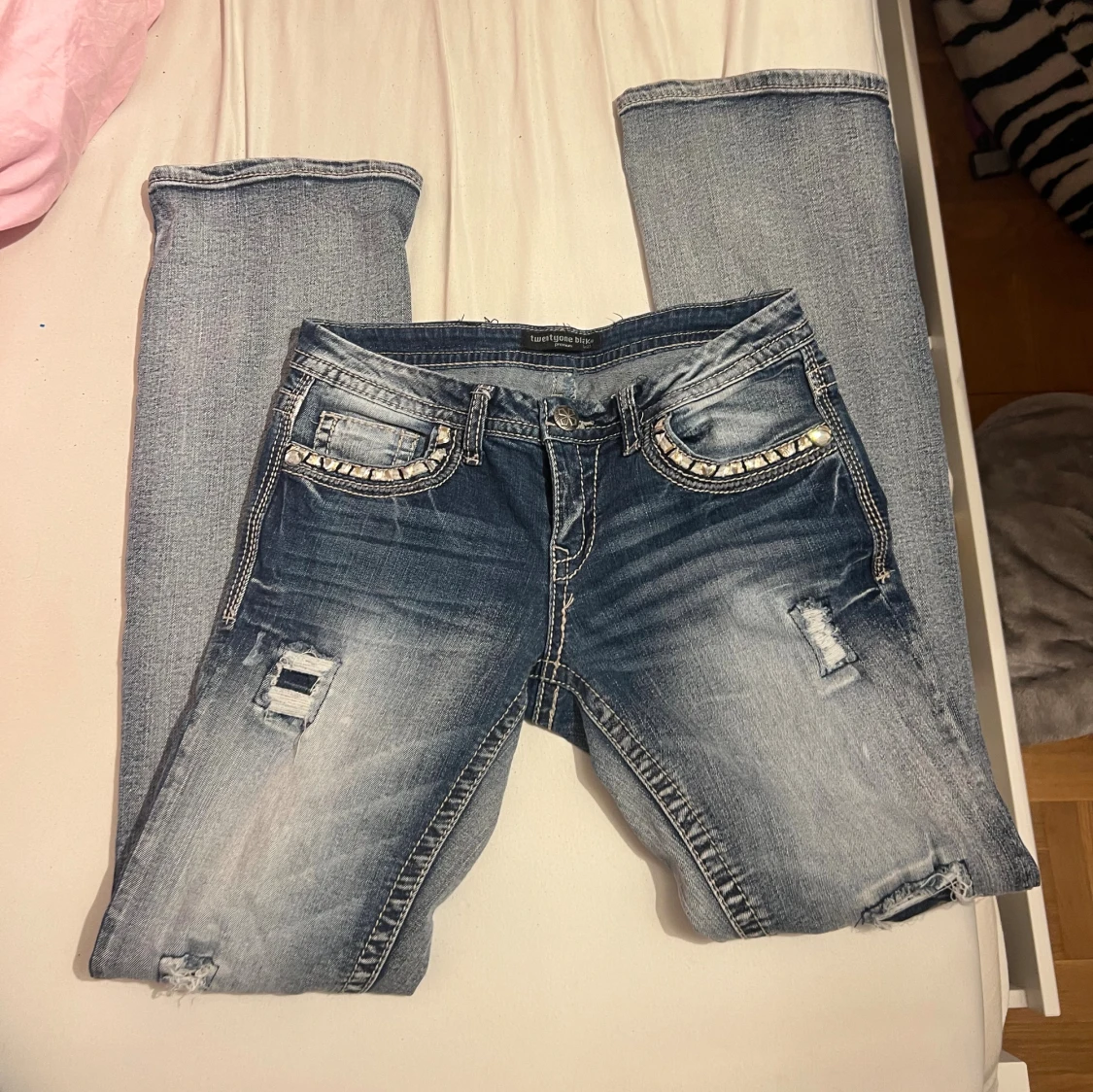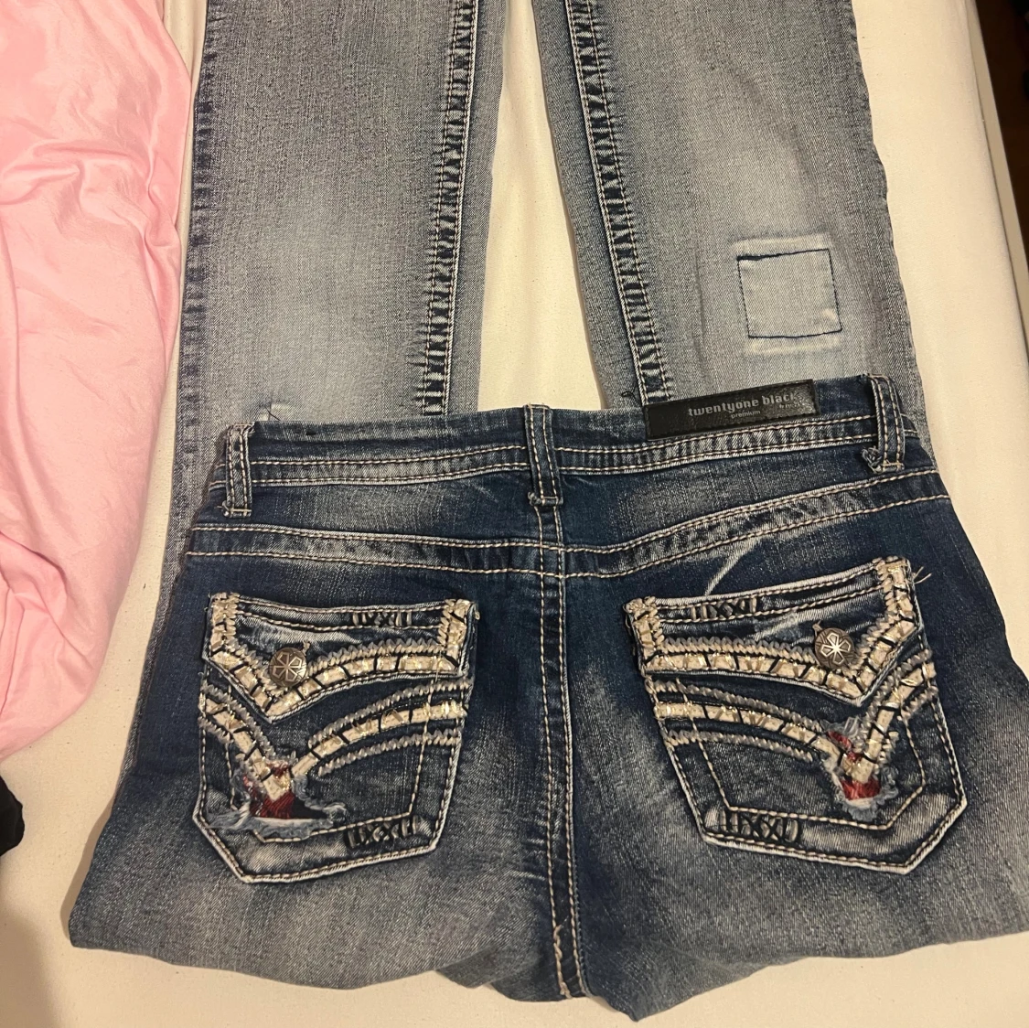 Snygga blå jeans med bootcut från Twentyone Black. De har slitna detaljer, patchar och coola broderier på fickorna. Låg midja och kontrastsömmar ger en edgy vibe. Perfekt för dig som gillar statement-jeans med unik look.