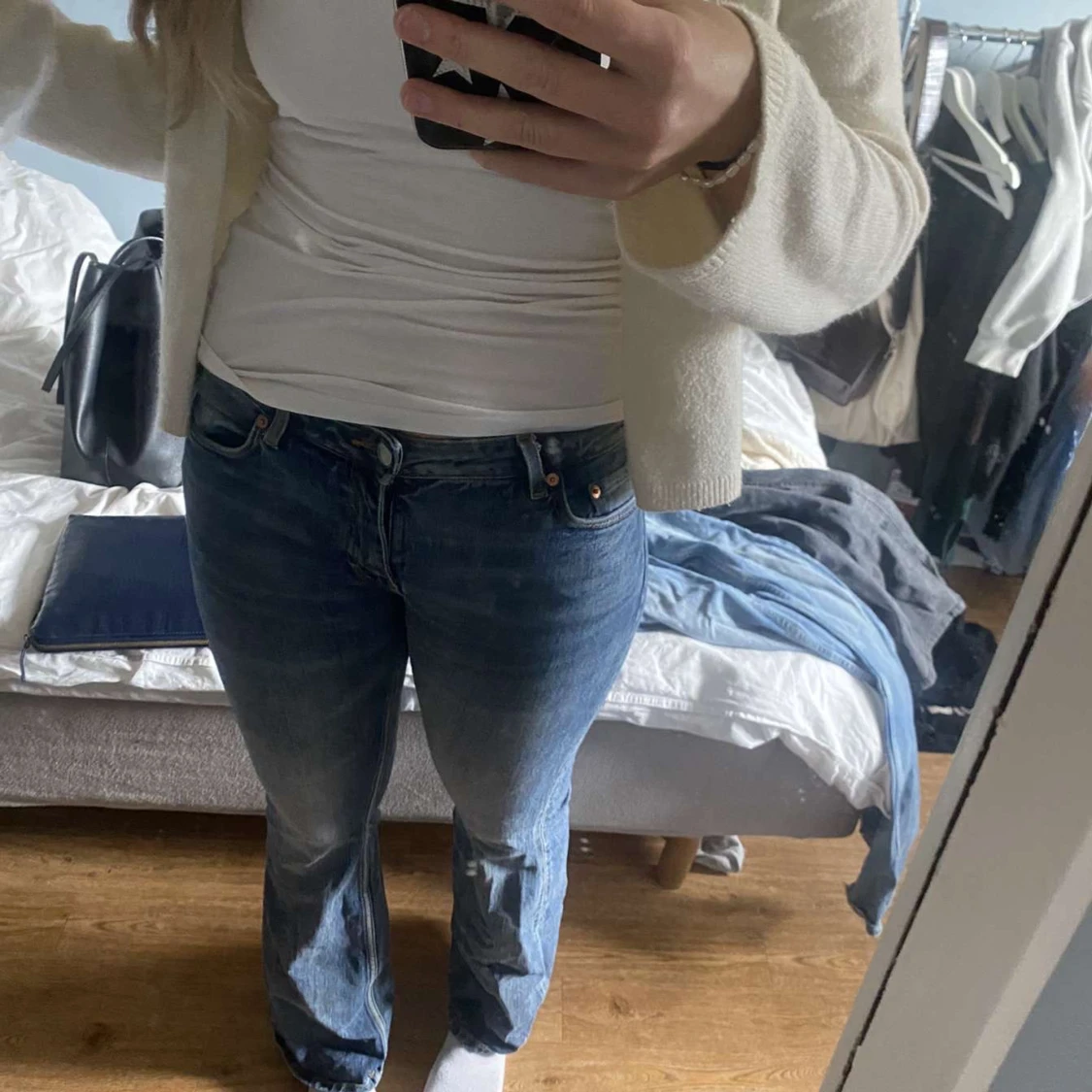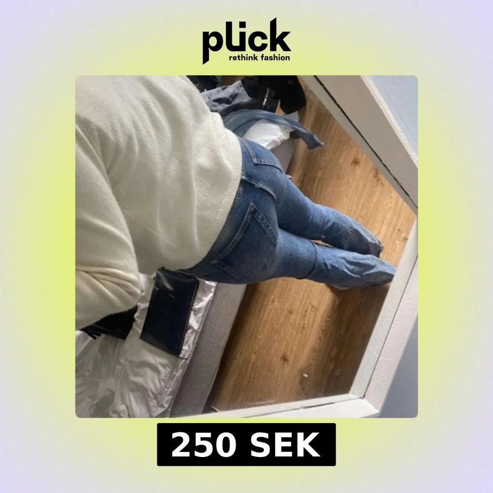 Säljer ett par klassiska blå weekday jeans med bootcut passform. Jeansen har låg midja och snyggt slitna detaljer. Perfekta för dig som gillar en tidlös och avslappnad stil. Materialet är robust denim i bomull. Lite små i storleken