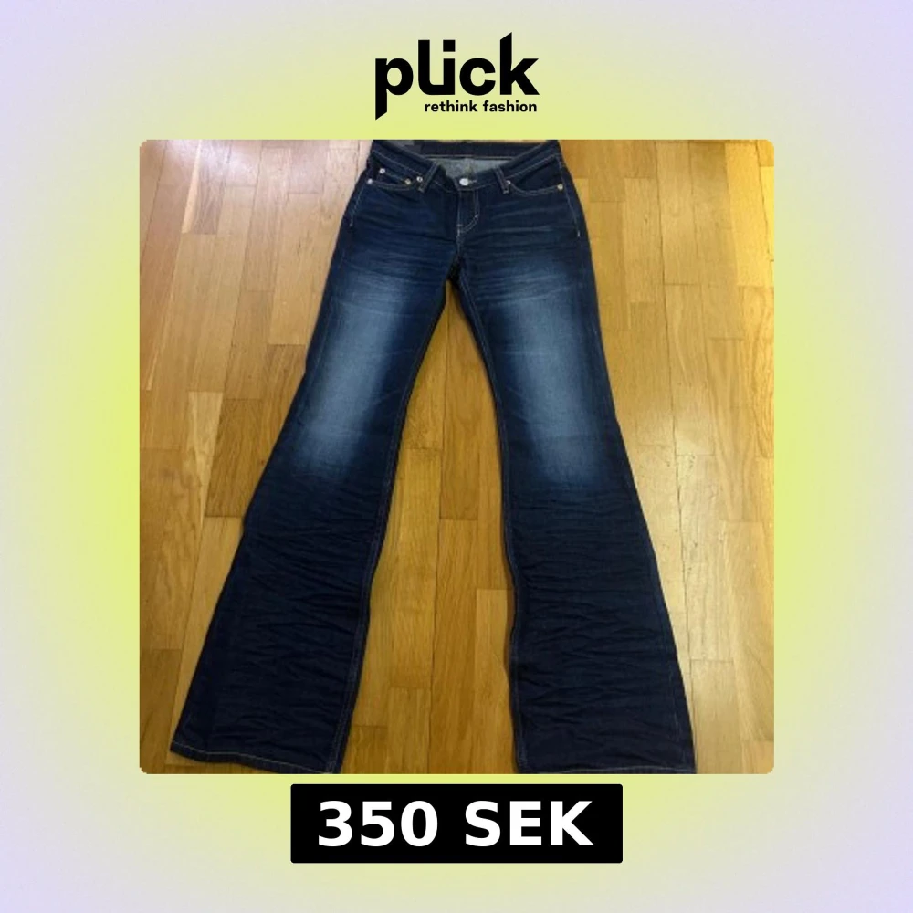 Säljer ett par mörkblå bootcut jeans från Weekday, modell Nova. Jeansen har låg midja, klassisk femficksdesign och är gjorda i ekologisk och återvunnen bomull. Snygg tvätt med ljusare partier på låren och utsvängda ben. Har aldrig använt byxorna
