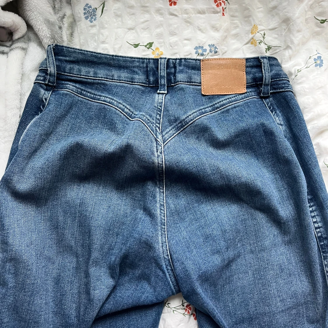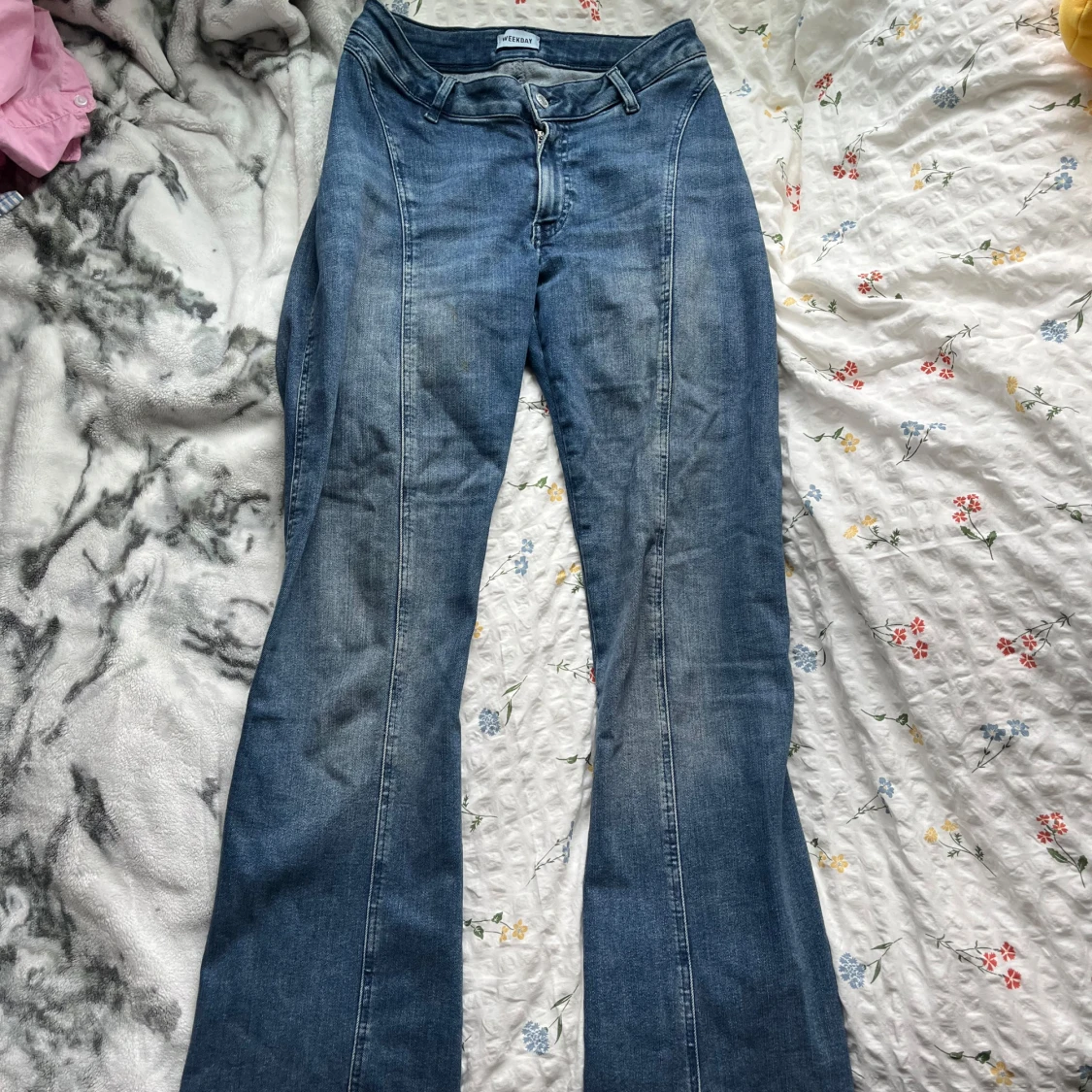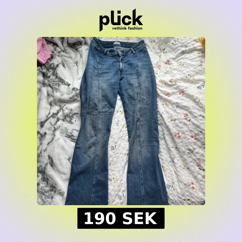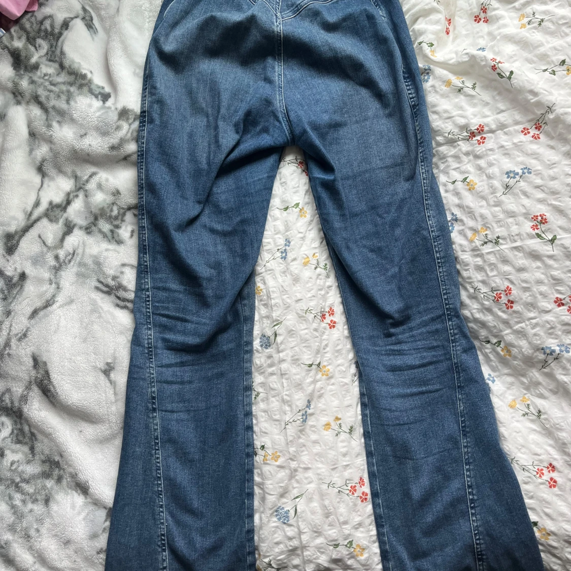 Säljer ett par klassiska blå jeans med bootcut-silhuett och snygga söm-detaljer längs benen. Jeansen har normal midja till lägre midja, bälteshällor och dragkedja framtill. Passar långa. Jag är 172 cm lång.
