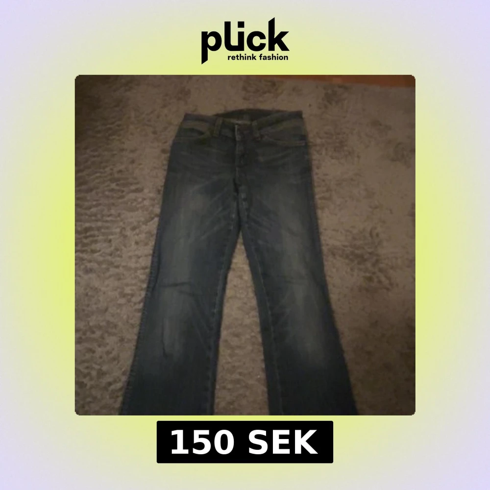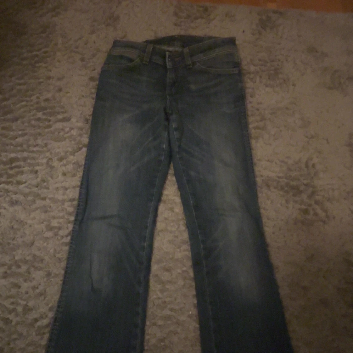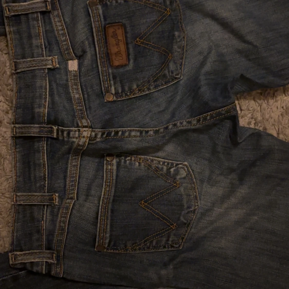Säljer ett par blå jeans från Wrangler som är bootcut . Jeansen har snygga slitningar, tydliga sömmar och Wrangler-logga på bakfickan. Lite för korta för mig som är 160 cm, skriv om ni har några frågor 💝💝