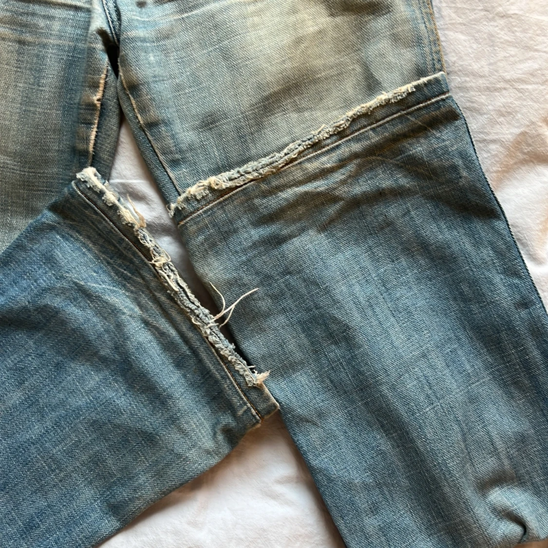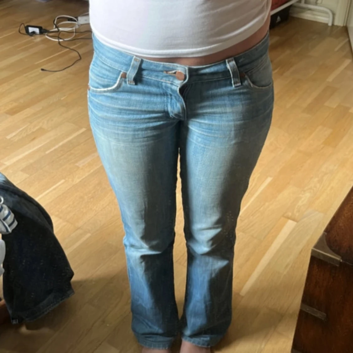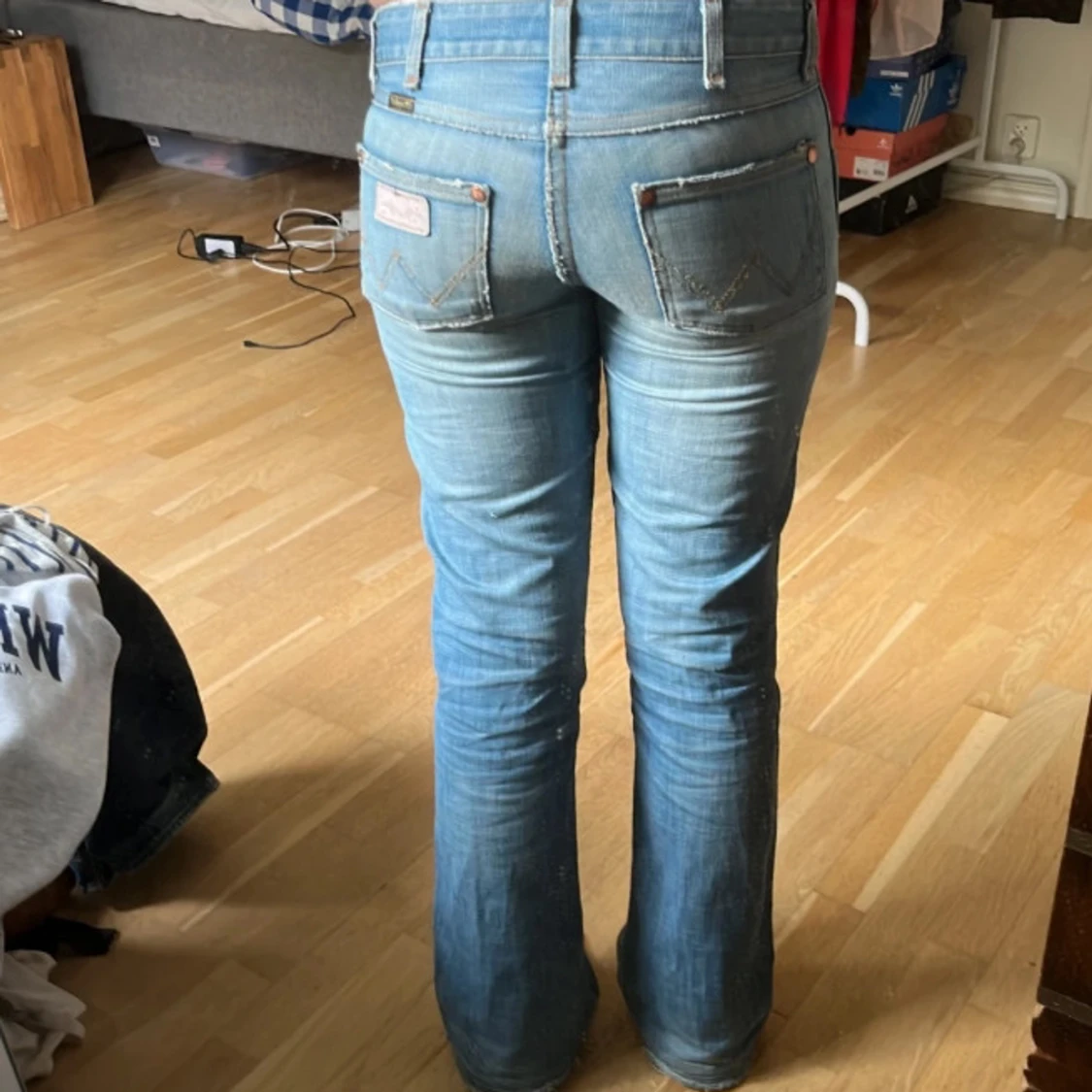 Säljer ett par skitsnygga klassiska blå wrangler jeans med bootcut passform och låg midja. Jeansen har fem fickor, knappgylf och små slitningar mellan benen och vid fötterna. Perfekta för dig som gillar en tidlös denimlook. Midjemått: 37-38. Innerbenslängd: ungefär 73. Skriv till mig om du vill ha fler bilder eller övriga frågor! Säljer de pga att de har blivit för små!💕
