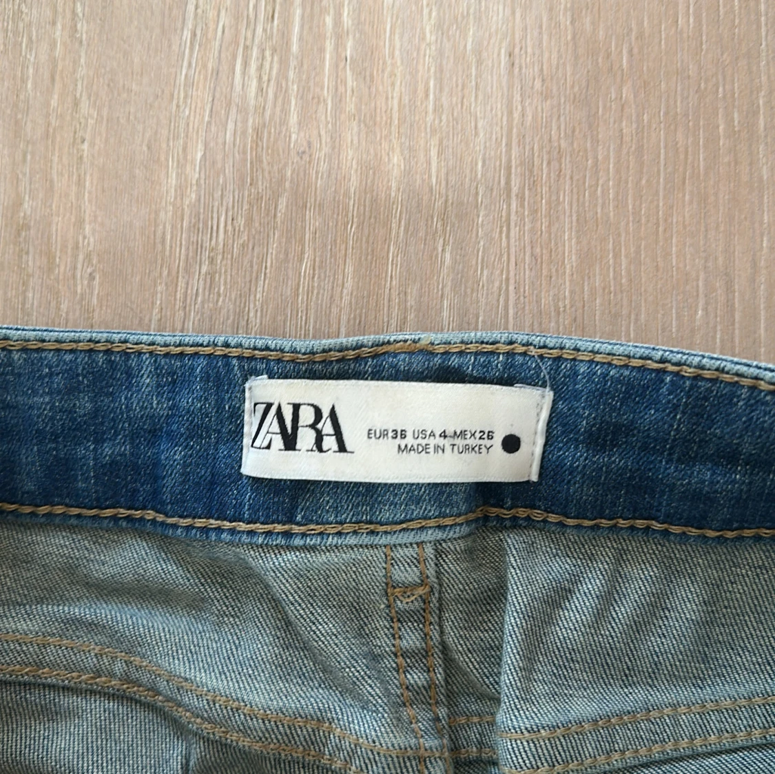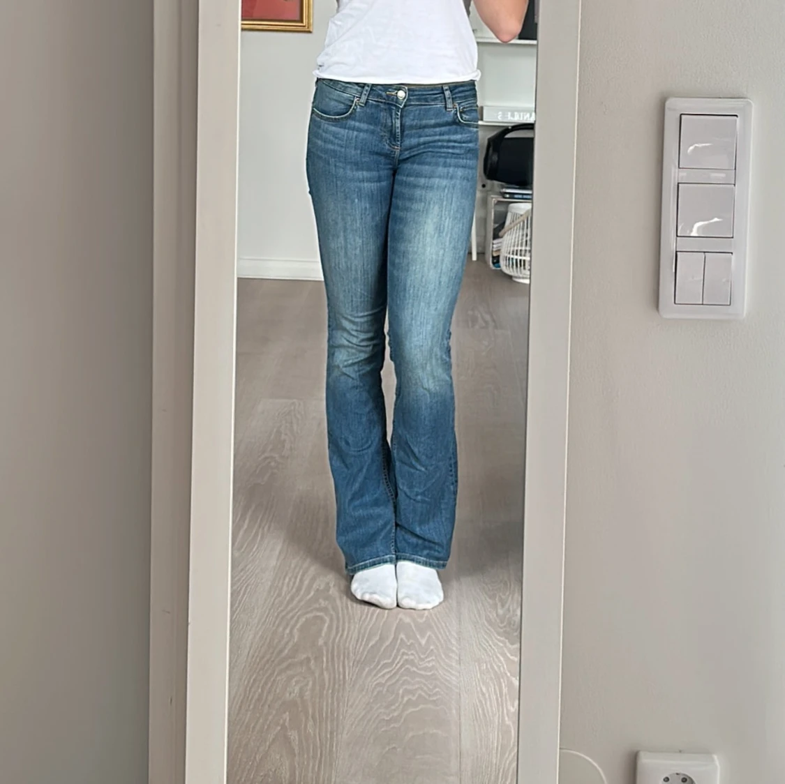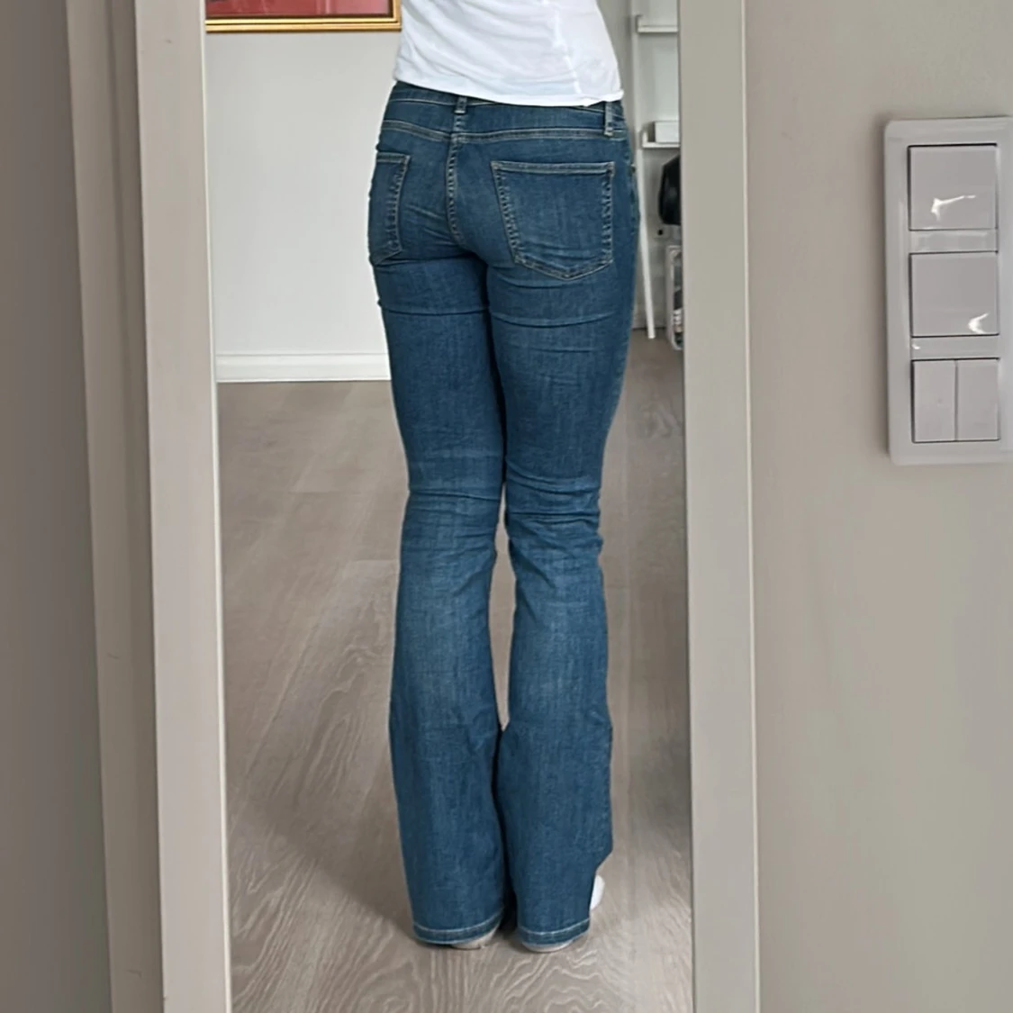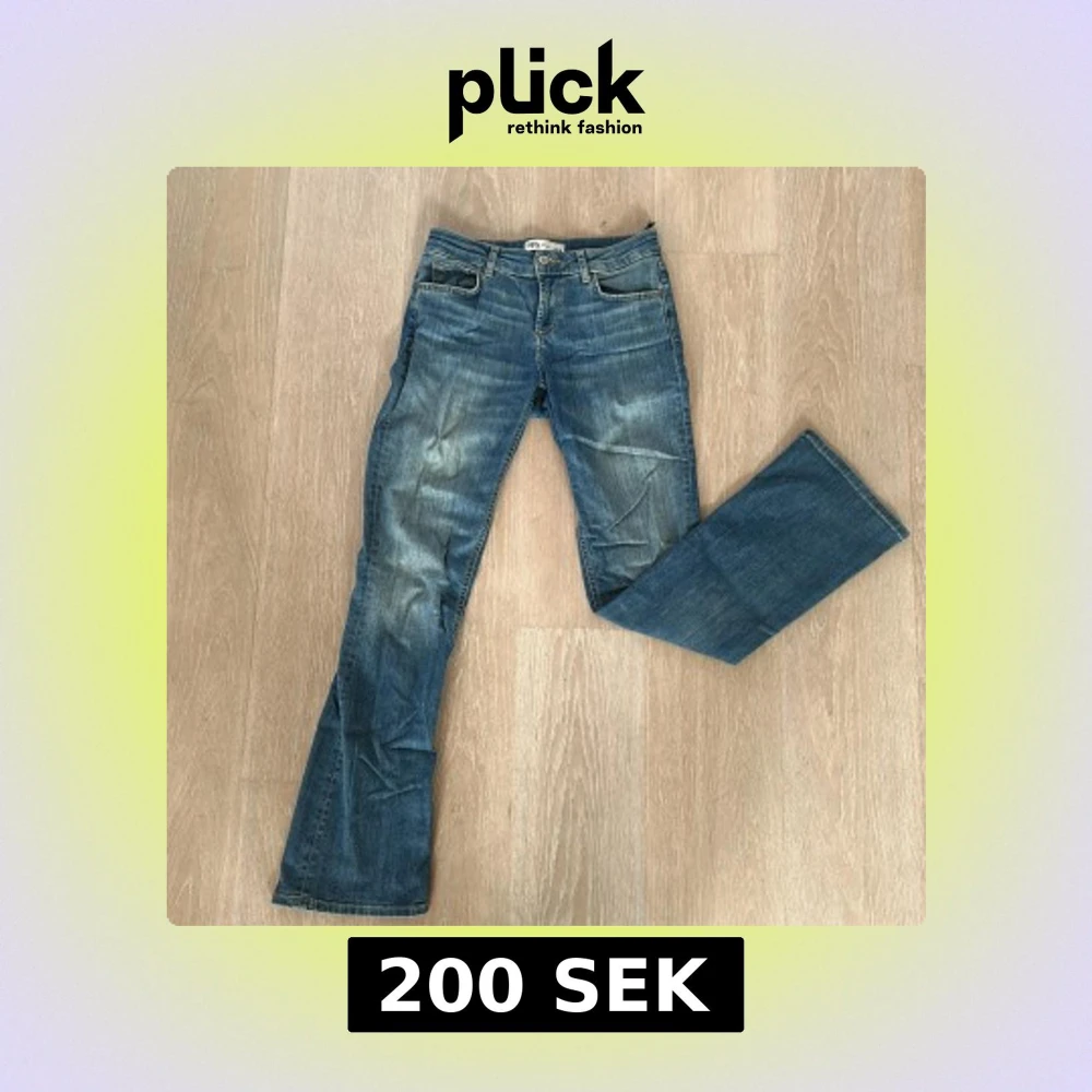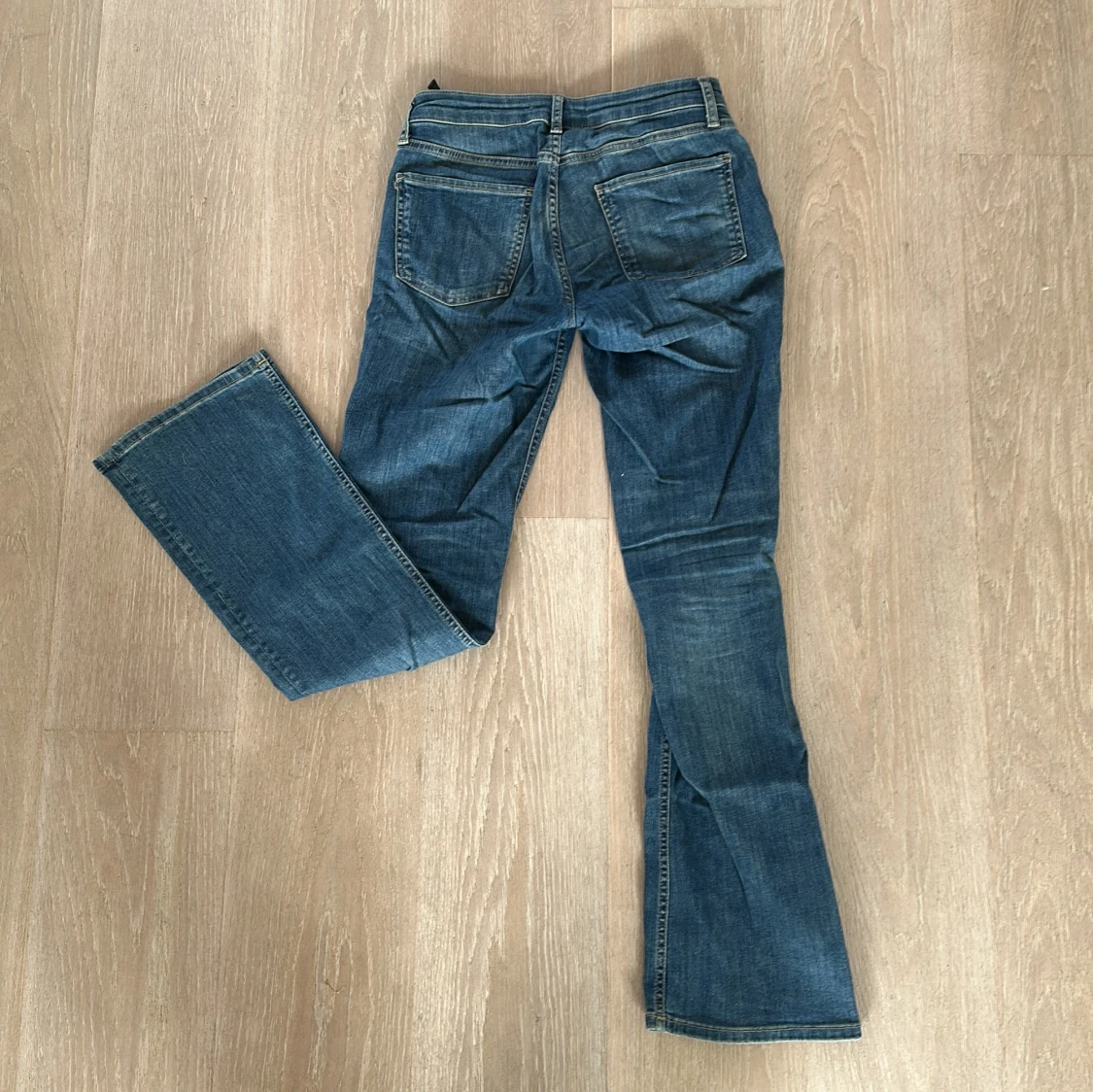 Snygga blå jeans från Zara i klassisk bootcut-modell. Jeansen har normal passform, jag är 1,70 m. Materialet är med lätt stretch. Byxorna är använda men i bra skick