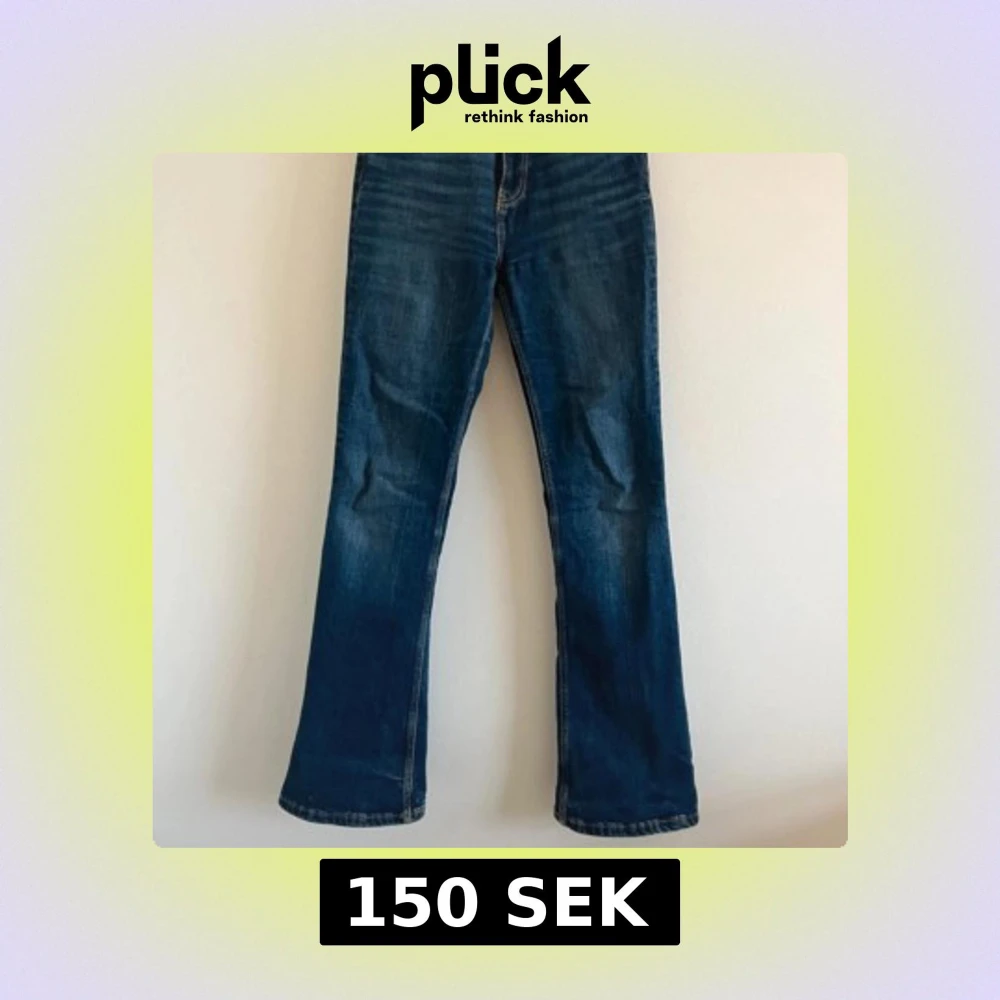 Snygga blå jeans från Zara med bootcut-modell och klassisk femficksdesign. Jeansen har hög midja och är tillverkade i ett robust denimtyg med lätt slitning för en cool look. Perfekta till sneakers eller boots.