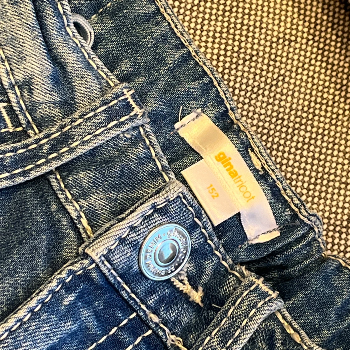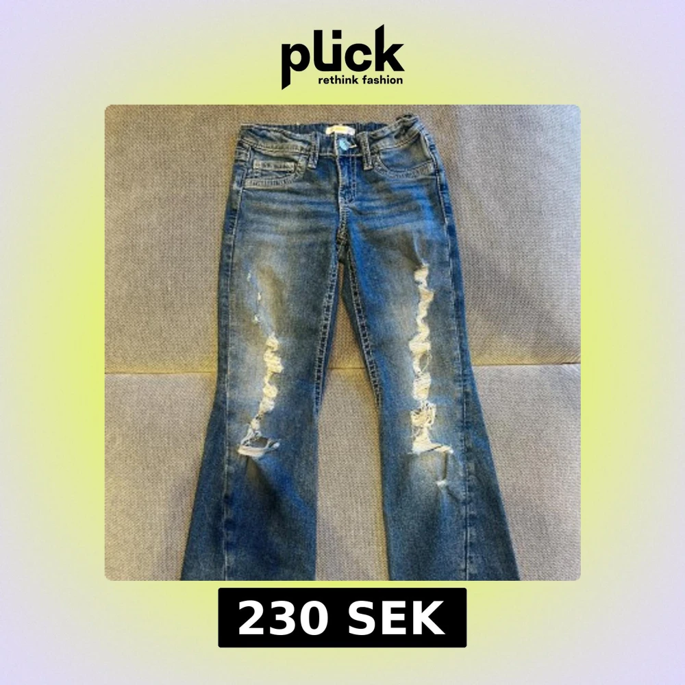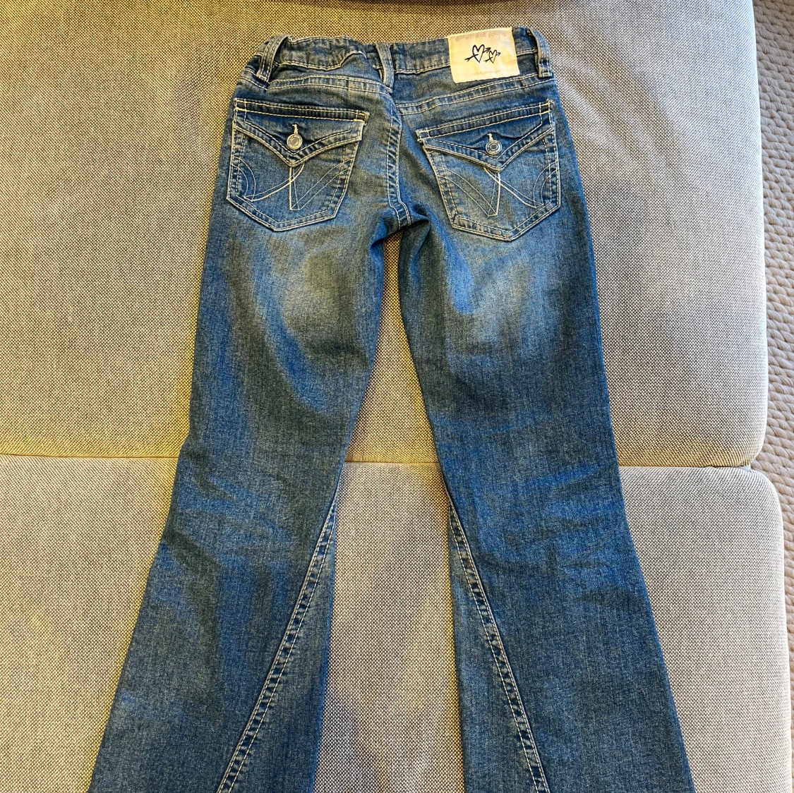 Snygga blå bootcut jeans från Gina Tricot med slitna detaljer framtill och coola bakfickor med knappar. Jeansen har kontrastsömmar och klassisk femficksdesign. Perfekta för dig som gillar en avslappnad och trendig look.
