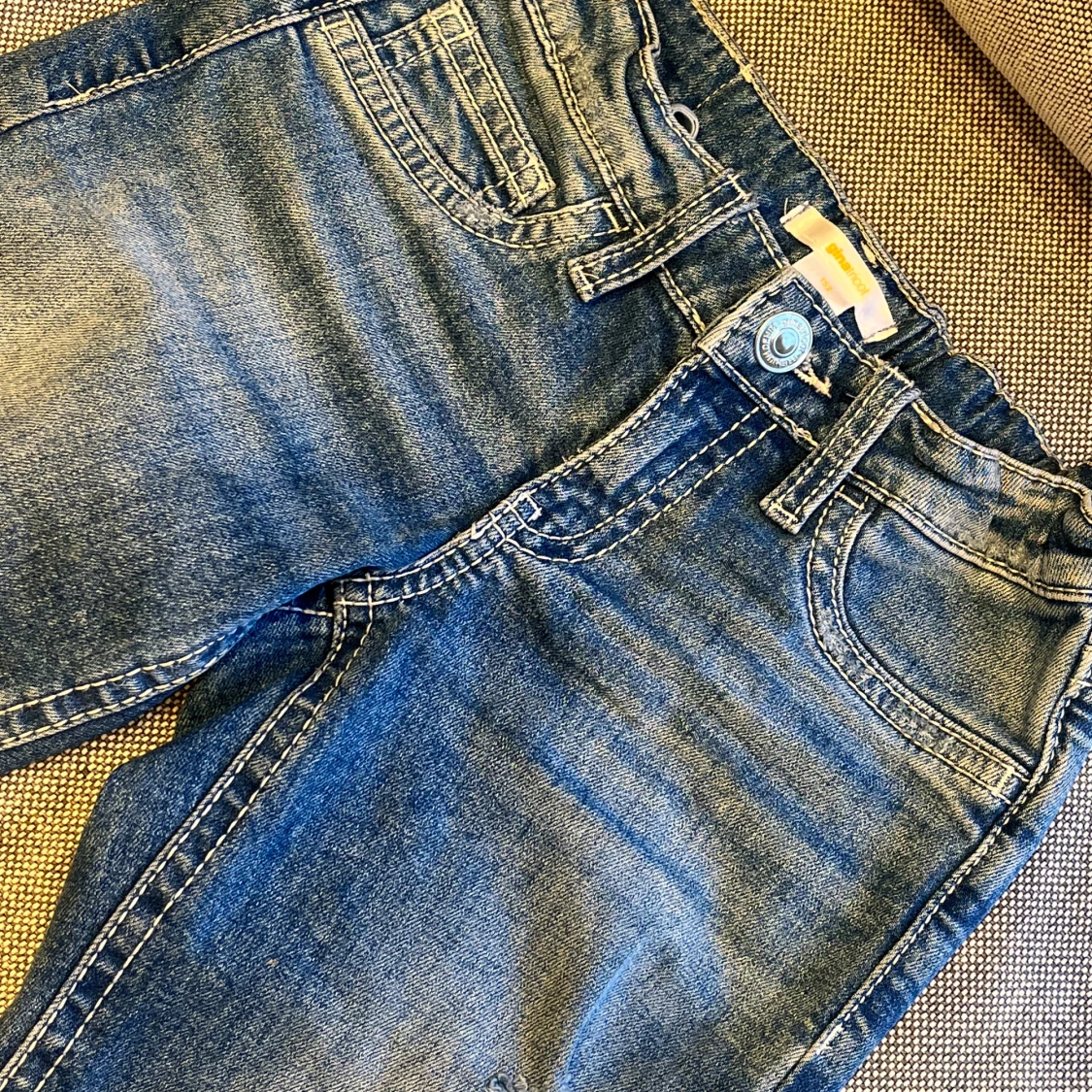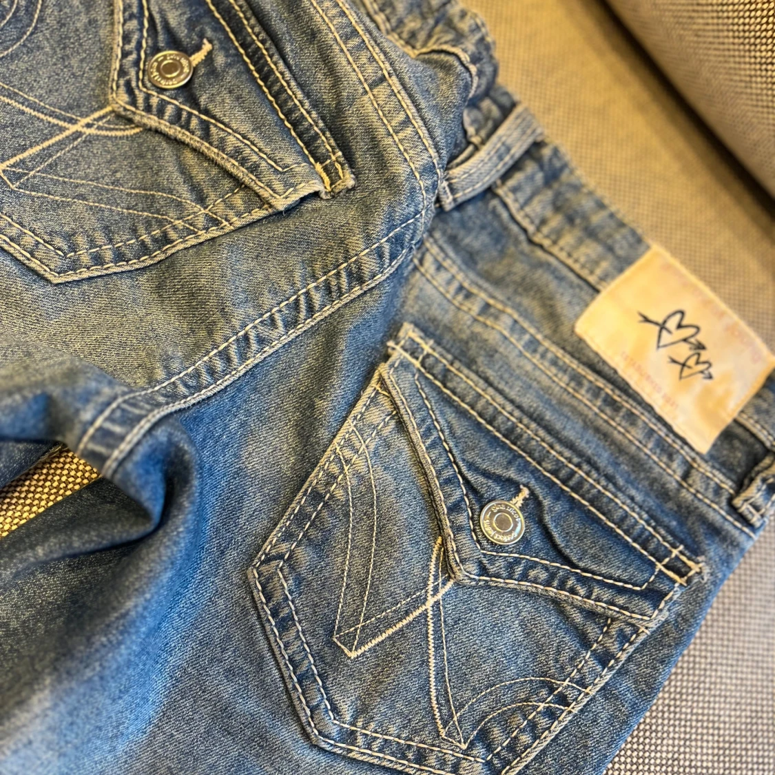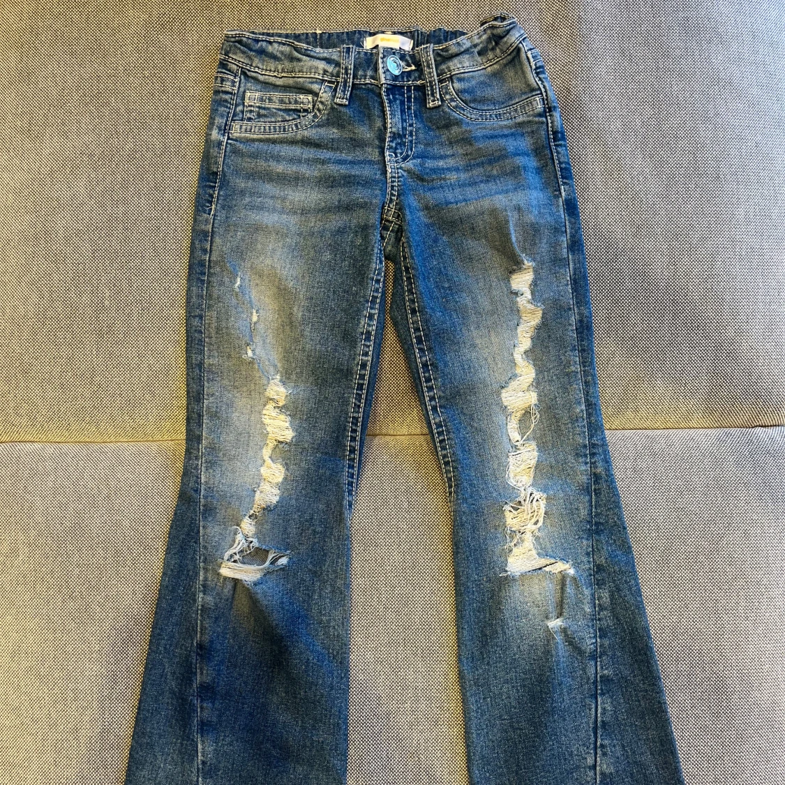 Snygga blå bootcut jeans från Gina Tricot med slitna detaljer framtill och coola bakfickor med knappar. Jeansen har kontrastsömmar och klassisk femficksdesign. Perfekta för dig som gillar en avslappnad och trendig look.