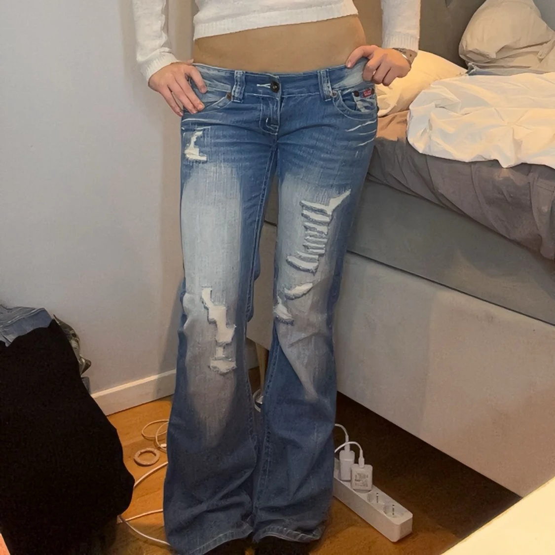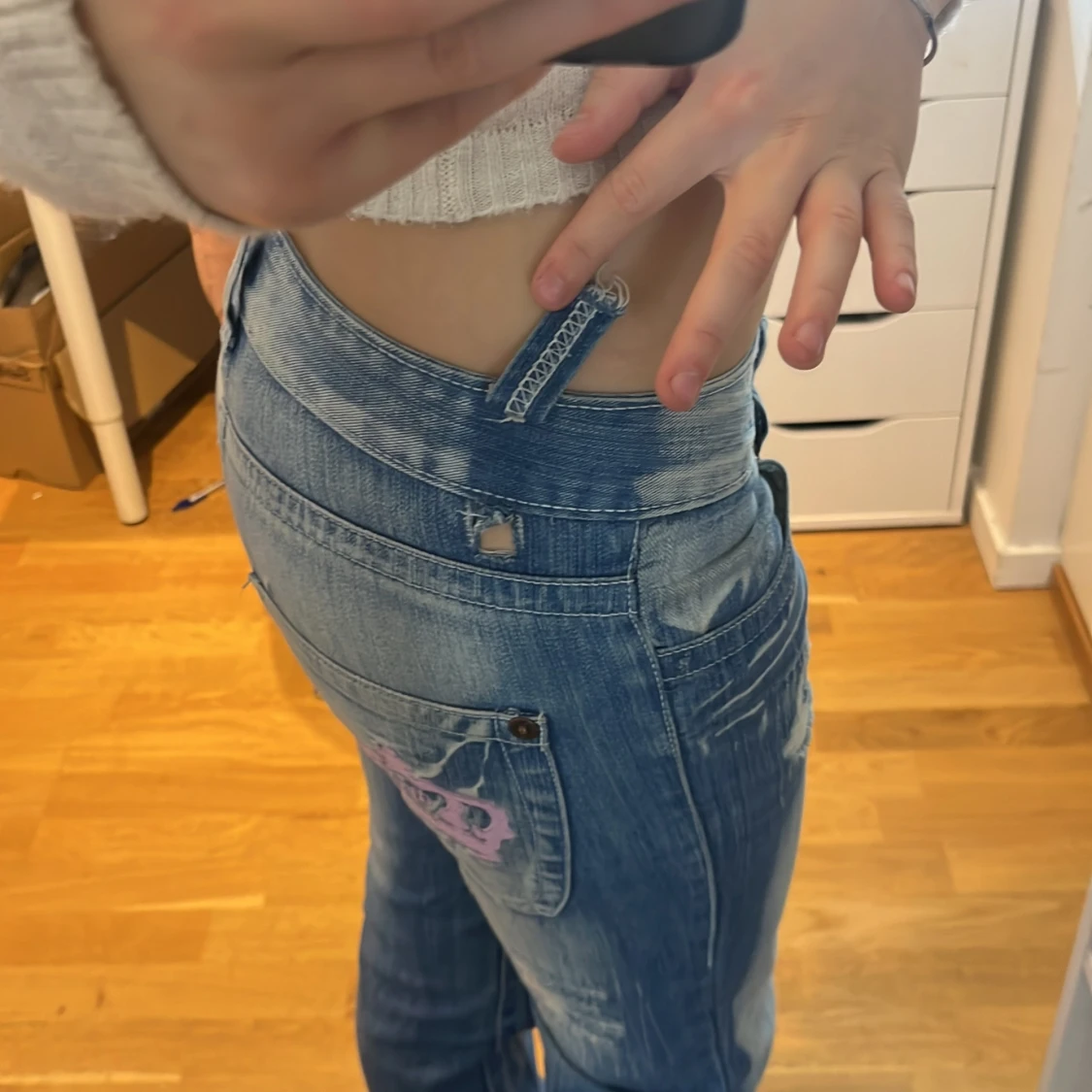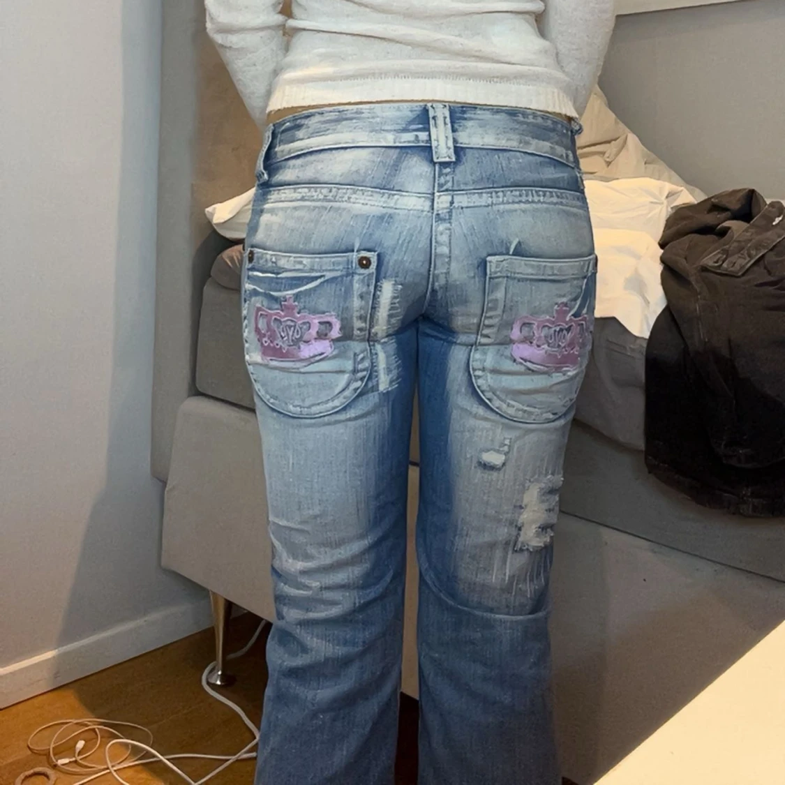 Säljer ett par ljusblå botcut jeans med låg midja. Baksidan har stora fickor med rosa broderade Juicy-kronor. Jeansen har ljus tvätt, dragkedja och knapp framtill samt coola slitningar på benen. Dessvärre har varan en defekt som ni ser på bild 4 går lätt att sy ihop dock!