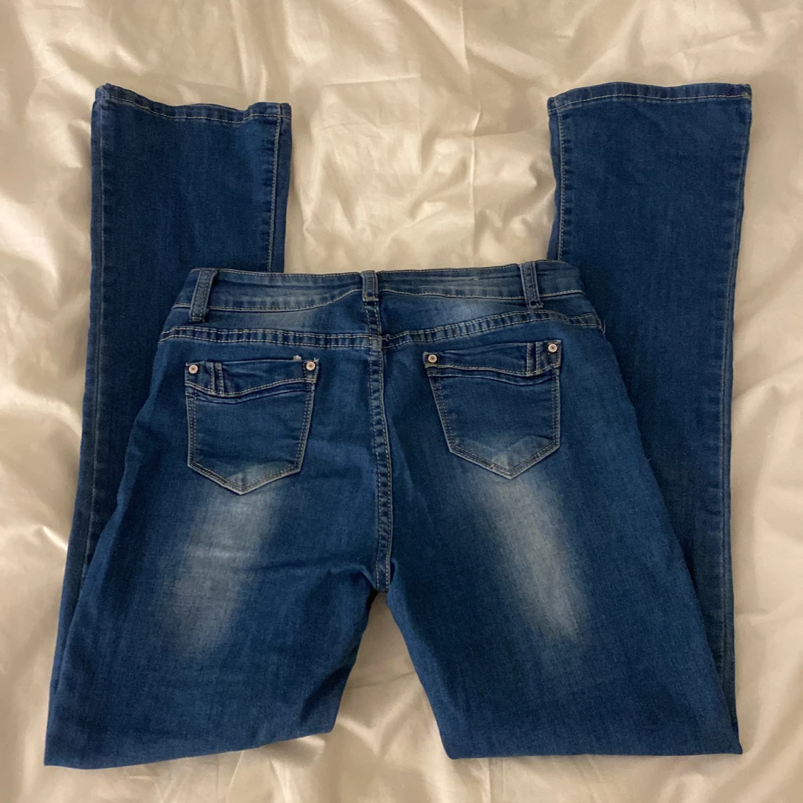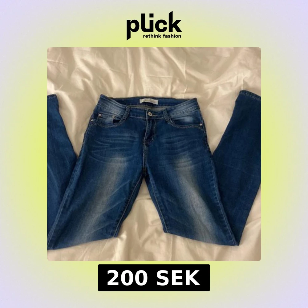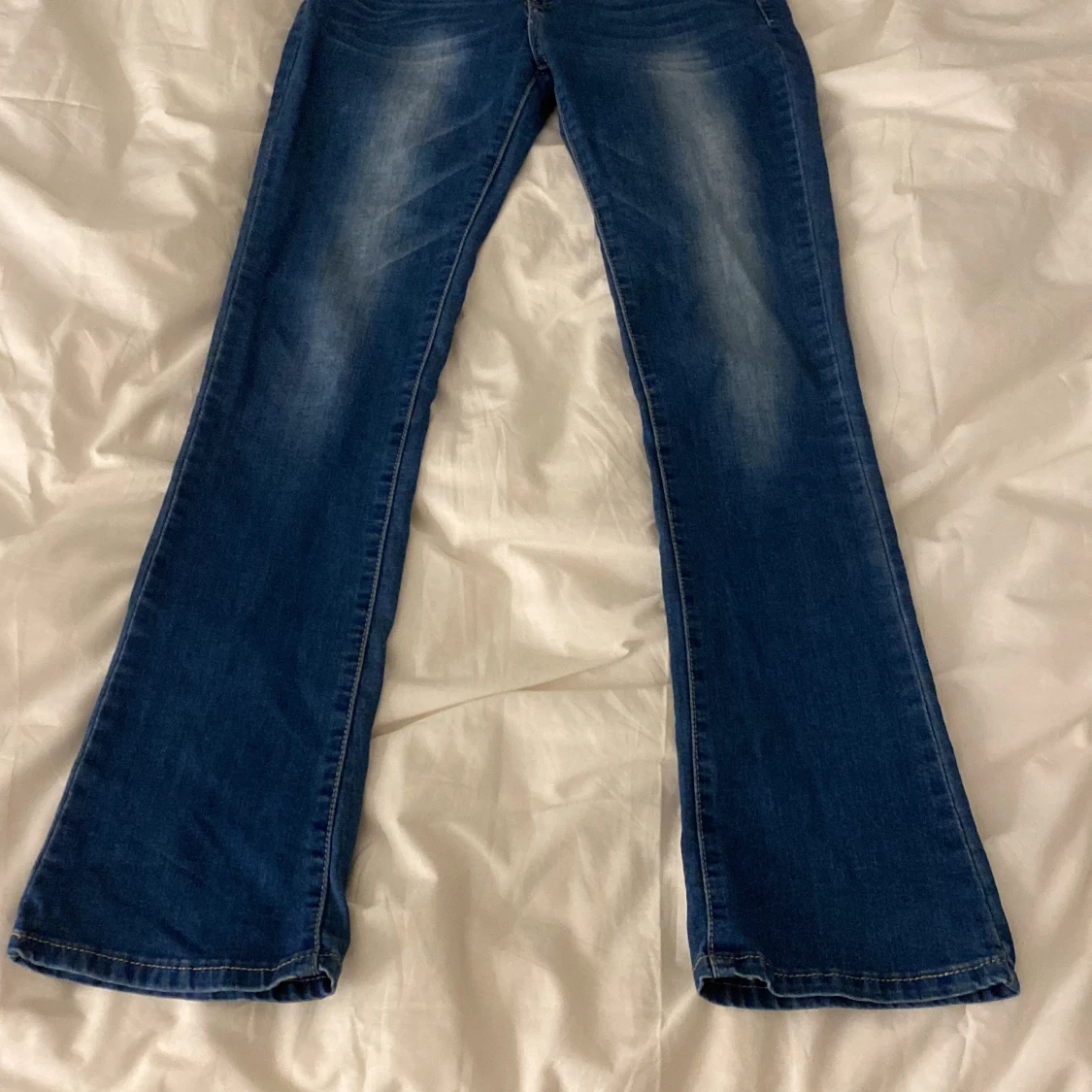 Snygga blåa jeans, inte mycket utsvängda vid benen men ändå lite. Märket är miss one och står inte storlek men skulle gissa på s/xs. Pris kan diskuteras! 💗