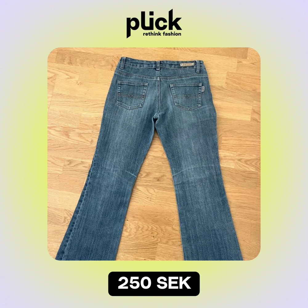 Säljer ett par snygga blå bootcut jeans i bra skick. Köpte second hand men tyvärr för små för mig, passar nog en xs. Så fina verkligen och jättenajs passform!