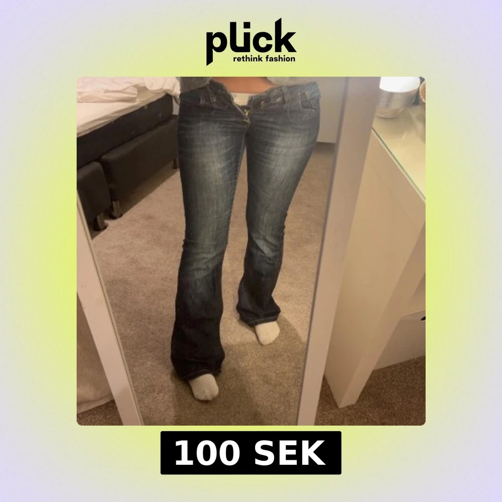 Snygga blå bootcut jeans med en klassisk femficksdesign och knappgylf. Knappen är med en tofs tyvärr men de syns ej när man knäpper. De är försmå på mig därför jag ej kan knäppa men de funkar och de är skitsnygga!! De är gammal modell men de står 36/32 alltså storlek 36
