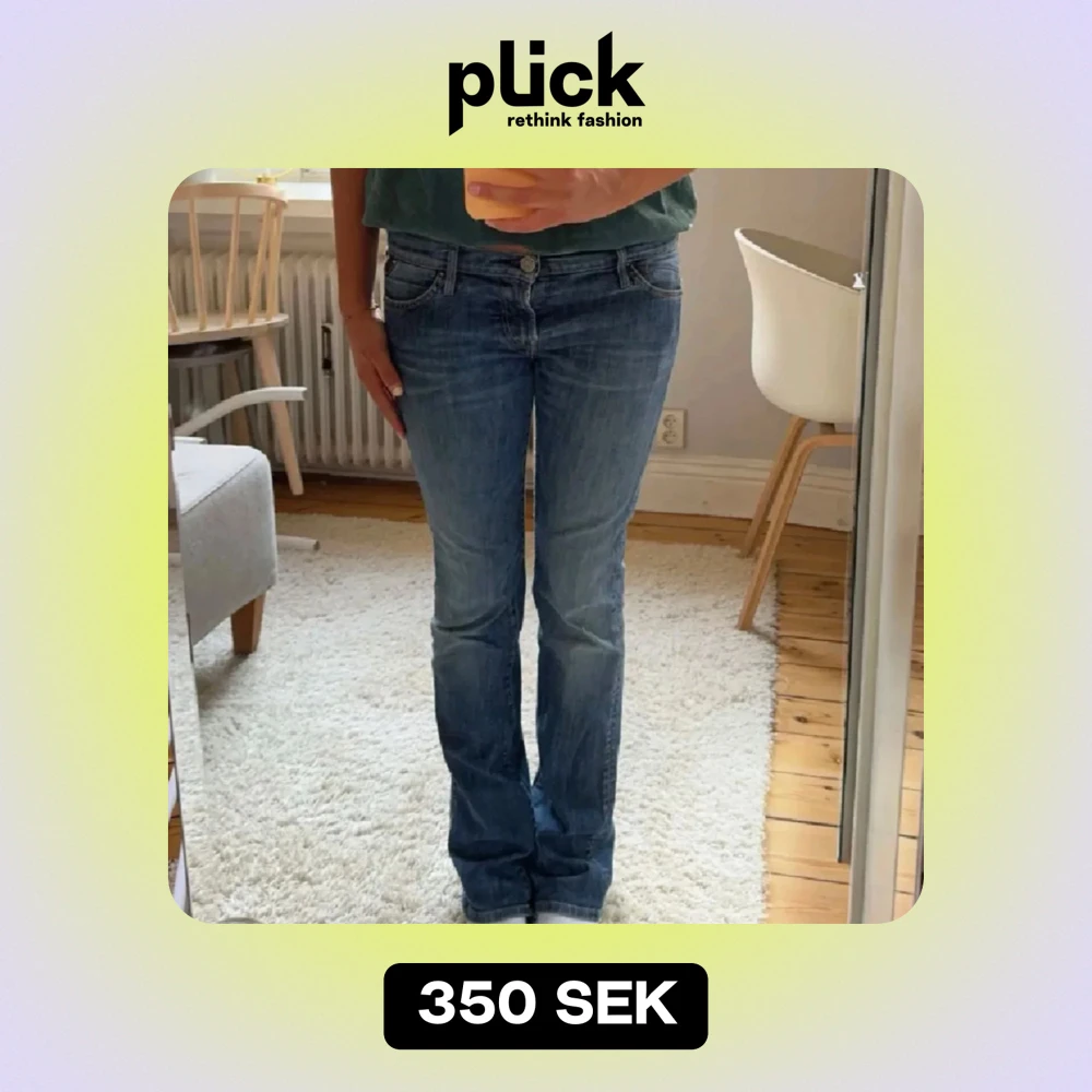 Säljer ett par snygga blå bootcut jeans från replay. De är i bra skick doch har en liten hål (se sista bild). Midjemått är 41cm och innerbenslängden är 78cm