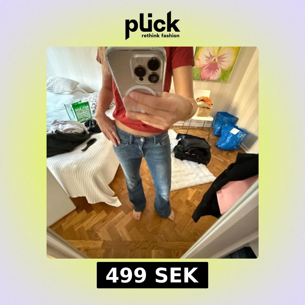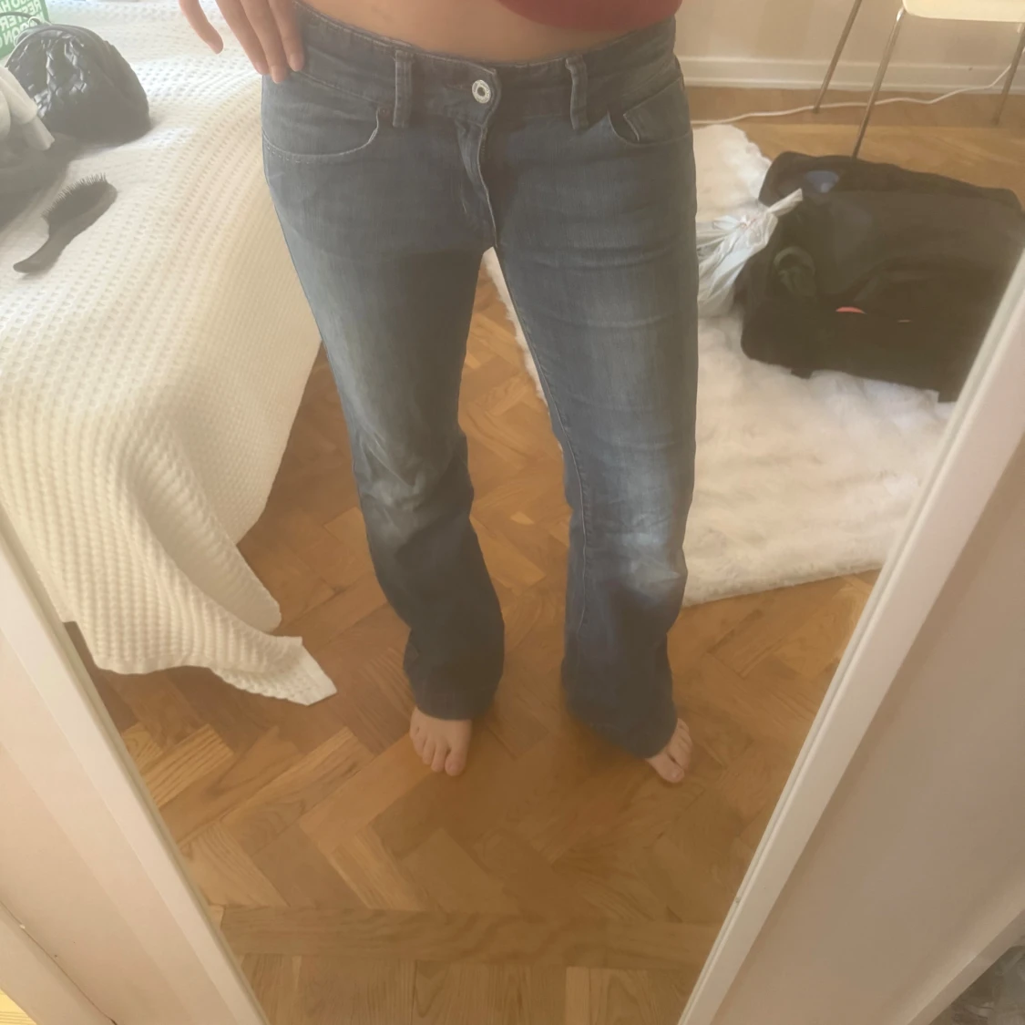 Säljer ett par klassiska blå jeans med bootcut och låg midja. Jeansen har en snygg tvättad look, fem fickor och bälteshällor. Perfekta för dig som gillar en avslappnad men ändå trendig stil. Materialet är jeans och passformen är normal.
