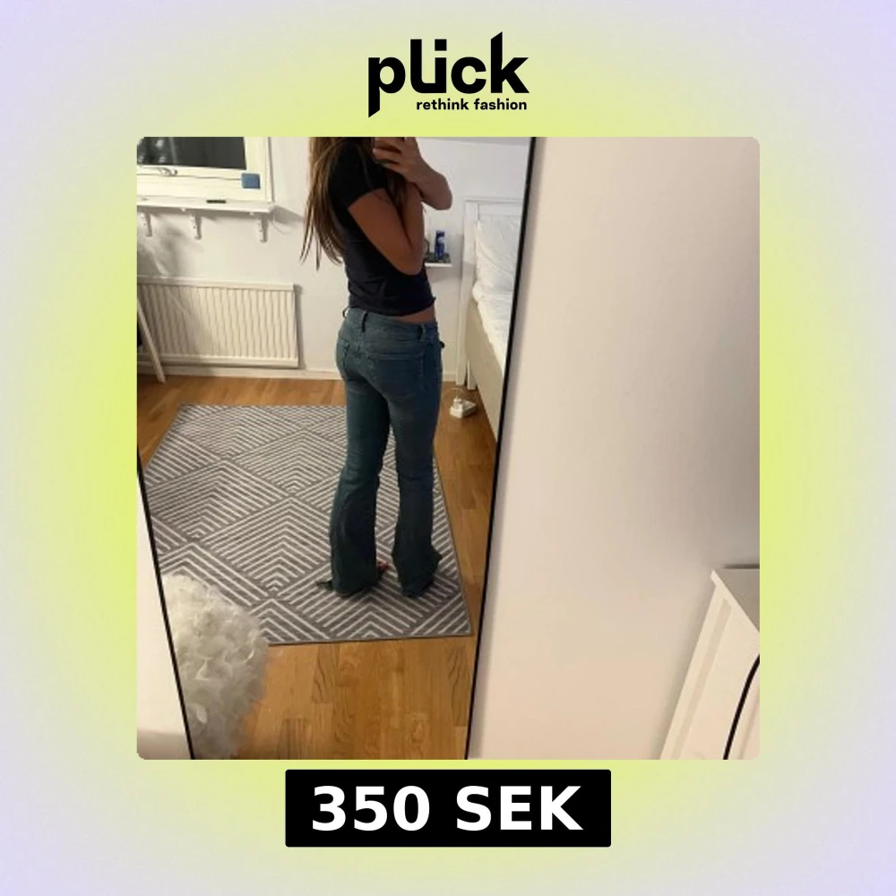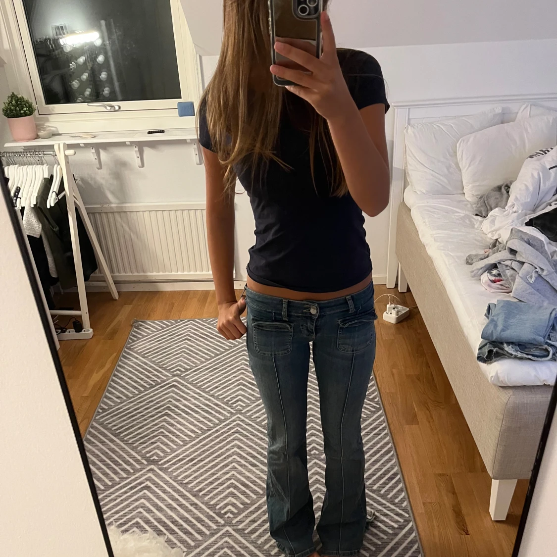 Säljer ett par blå jeans med bootcut och låg midja. Jeansen har klassiska fickor fram och bak, samt markerade sömmar längs benen. Materialet är jeans och passformen är normal med lite utsvängda ben. Perfekt för dig som gillar retrovibbar och avslappnad stil. Priset kan diskuteras men dem är köpa för 700💗💗