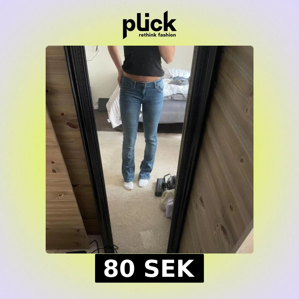Säljer ett par snygga blå jeans med bootcut passform och låg midja. Jeansen har klassisk femficksdesign och är gjorda i mjukt denim-material. Dom kommer från Only och är i storlek S.
