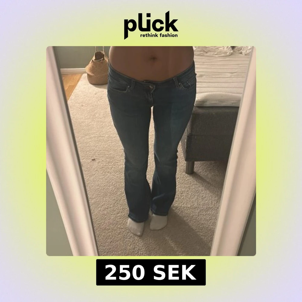 Snygga blå jeans med bootcut passform och låg midja. Klassisk femficksmodell med subtila slitningar och kontrastsömmar. Jeansen har en smickrande siluett som sitter tajt över låren och släpper ut vid vaden. Perfekta för en chill och trendig look.
