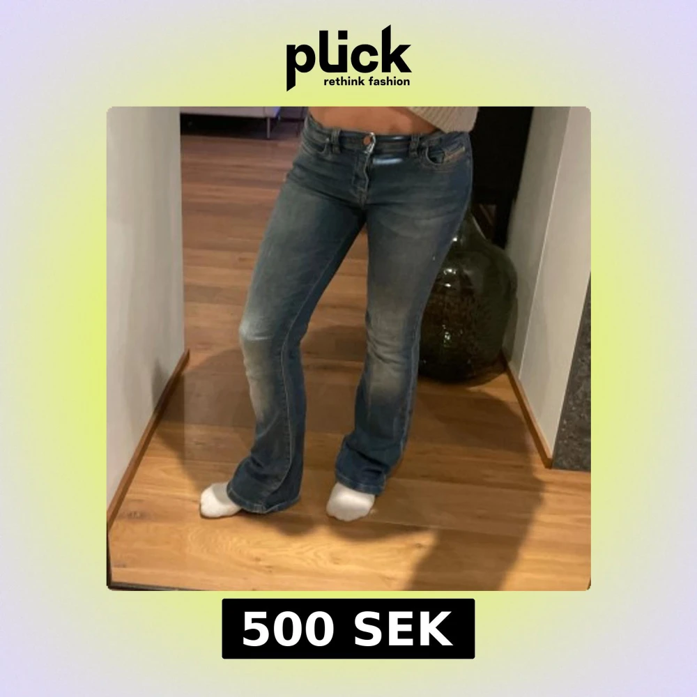 Snygga blå bootcut jeans från diesel industry med en snygg blekare färg ner längst benen (en lätt tvättad look). De är använda fåtal gånger. Dessa är i storlek 24/30, men passar folk med större eller mindre midjemått då de har så du kan spänna inuti i midjan.