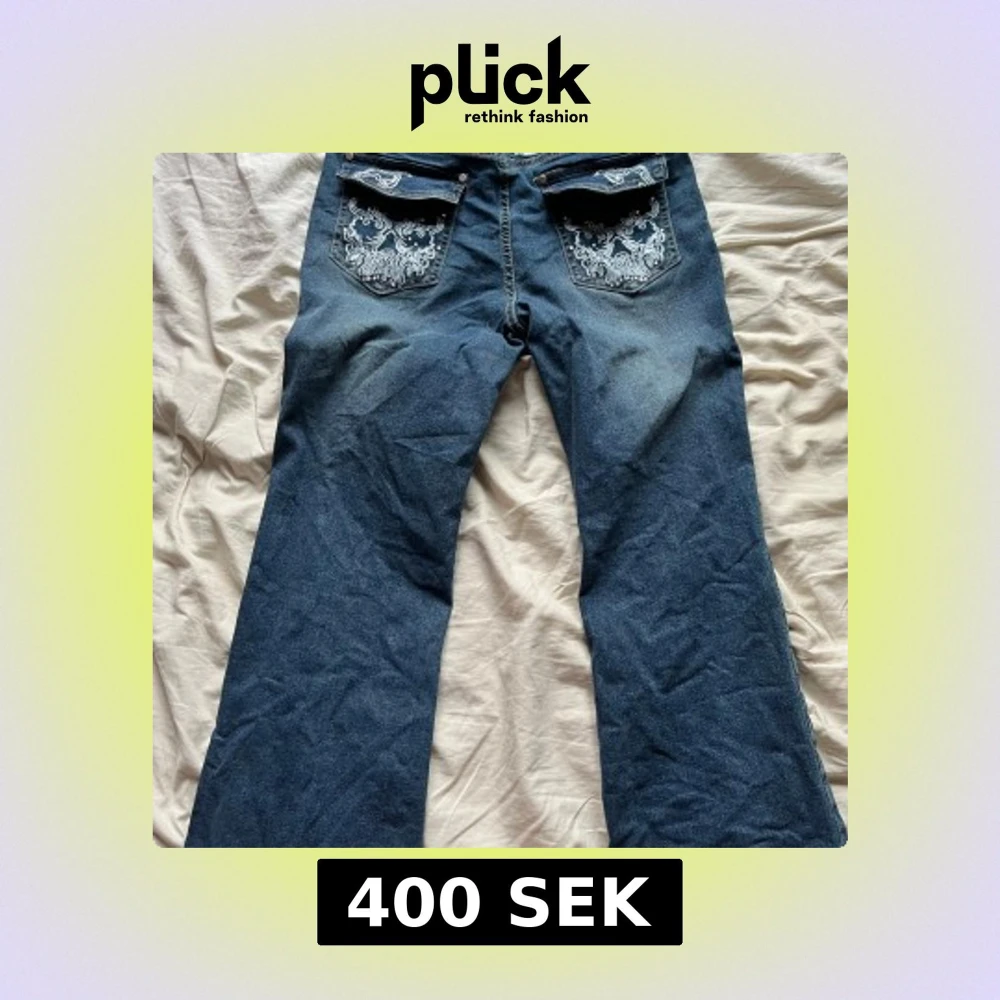 Säljer ett par blå bootcut jeans med snygga broderade detaljer på bakfickorna. Jeansen har en klassisk femficksdesign och är perfekta för dig som gillar en lite vidare passform nertill. Aldrig använda