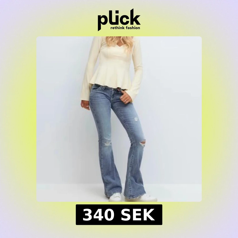 Snygga ljusblå bootcut jeans med slitningar på knäna och broderade bakfickor med paljetter. Säljer då dem är lite små men endast använda få gånger! Helt utan defekter, därför priset, men går att diskutera. 💕