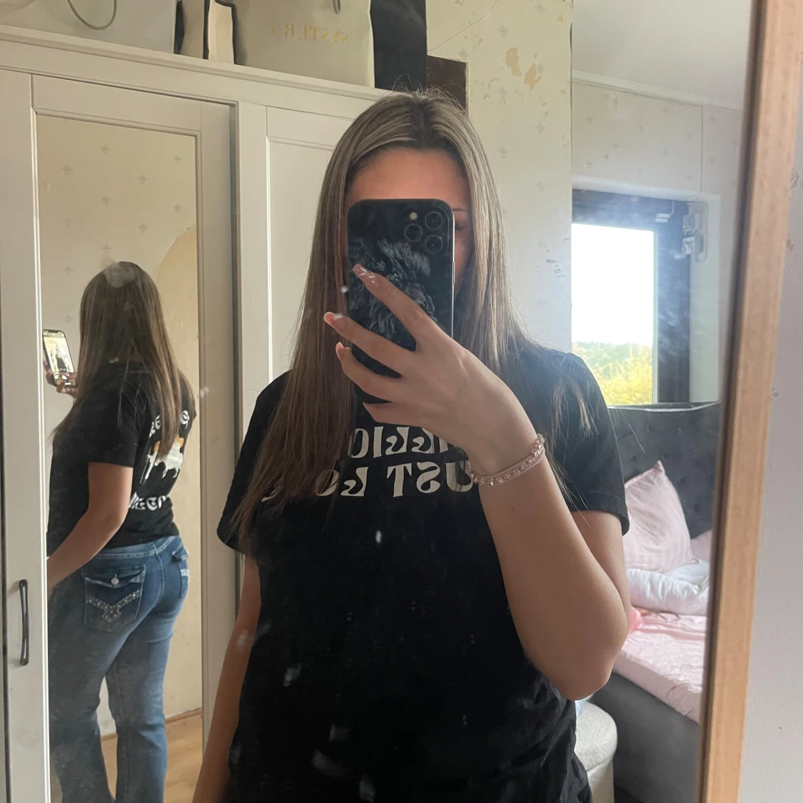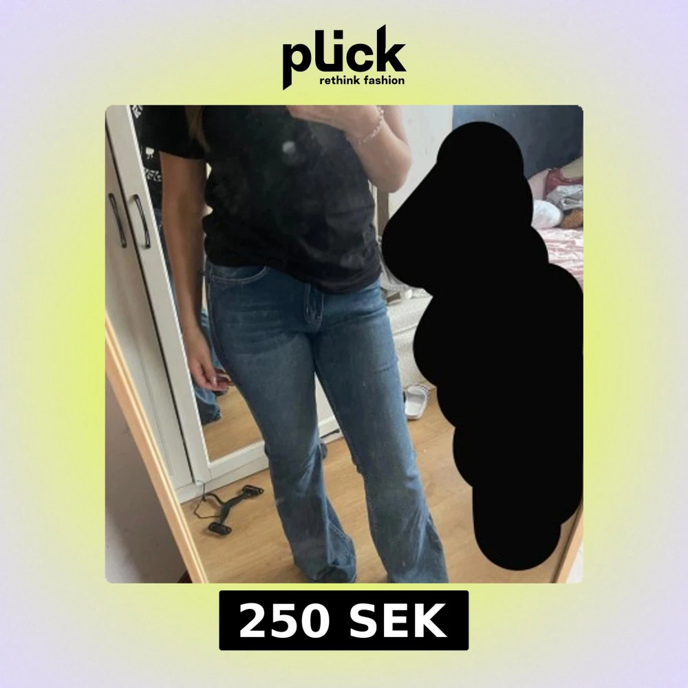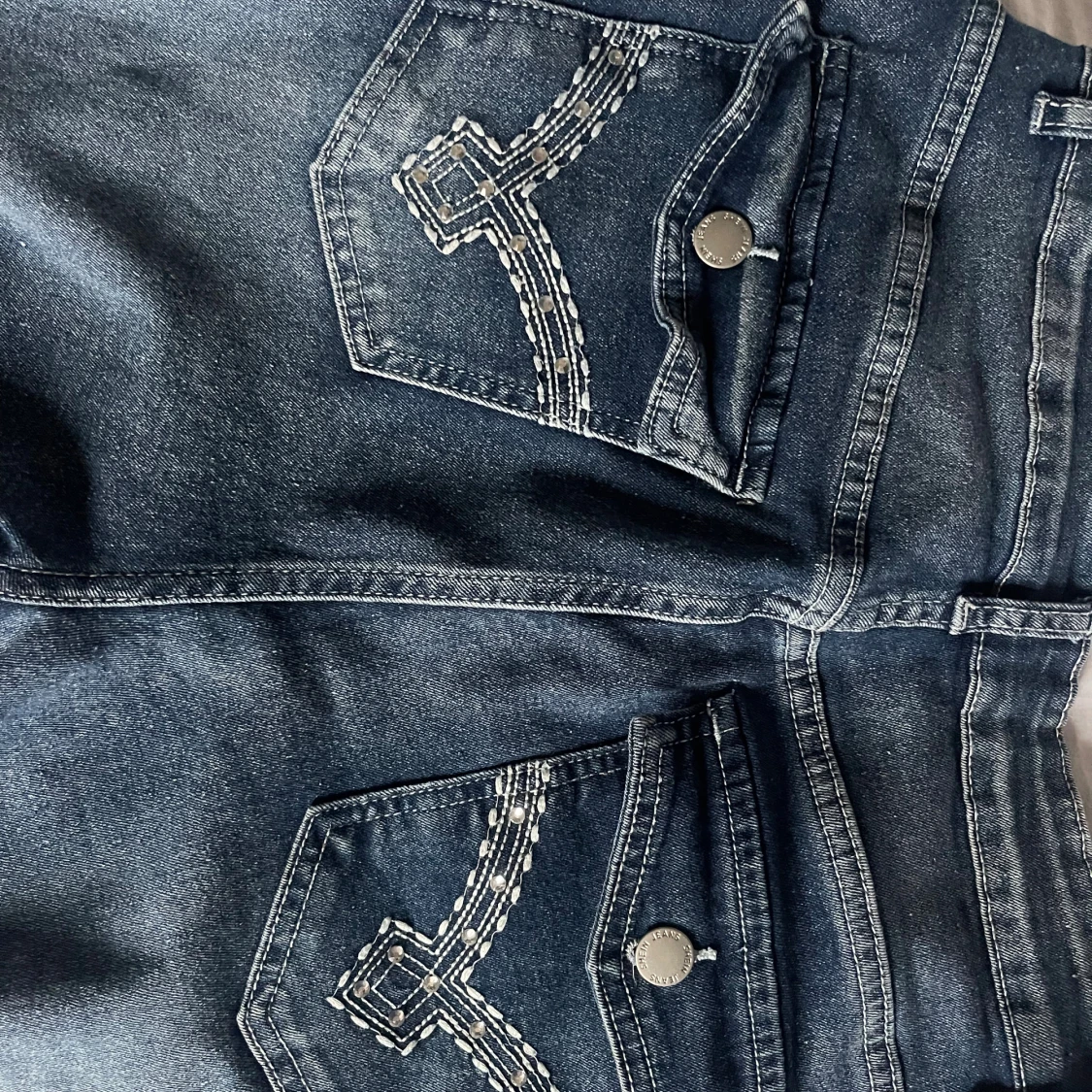 Säljer ett par blå jeans med bootcut passform och snygga broderade detaljer på bakfickorna. De är storlek S men jag skulle säga att de egentligen är M. Har aldrig använt dem då de var för stora och jag köpte ett mindre par.