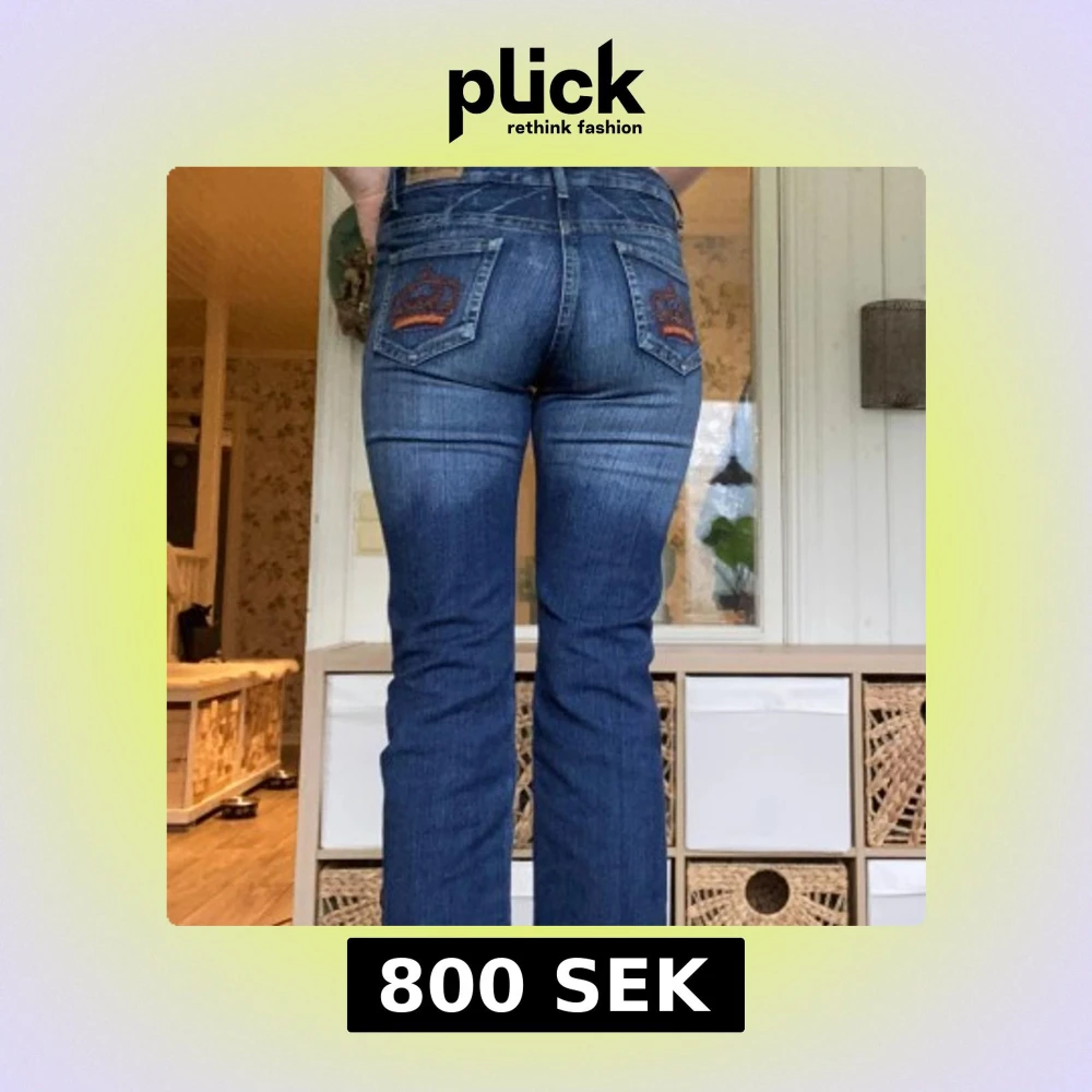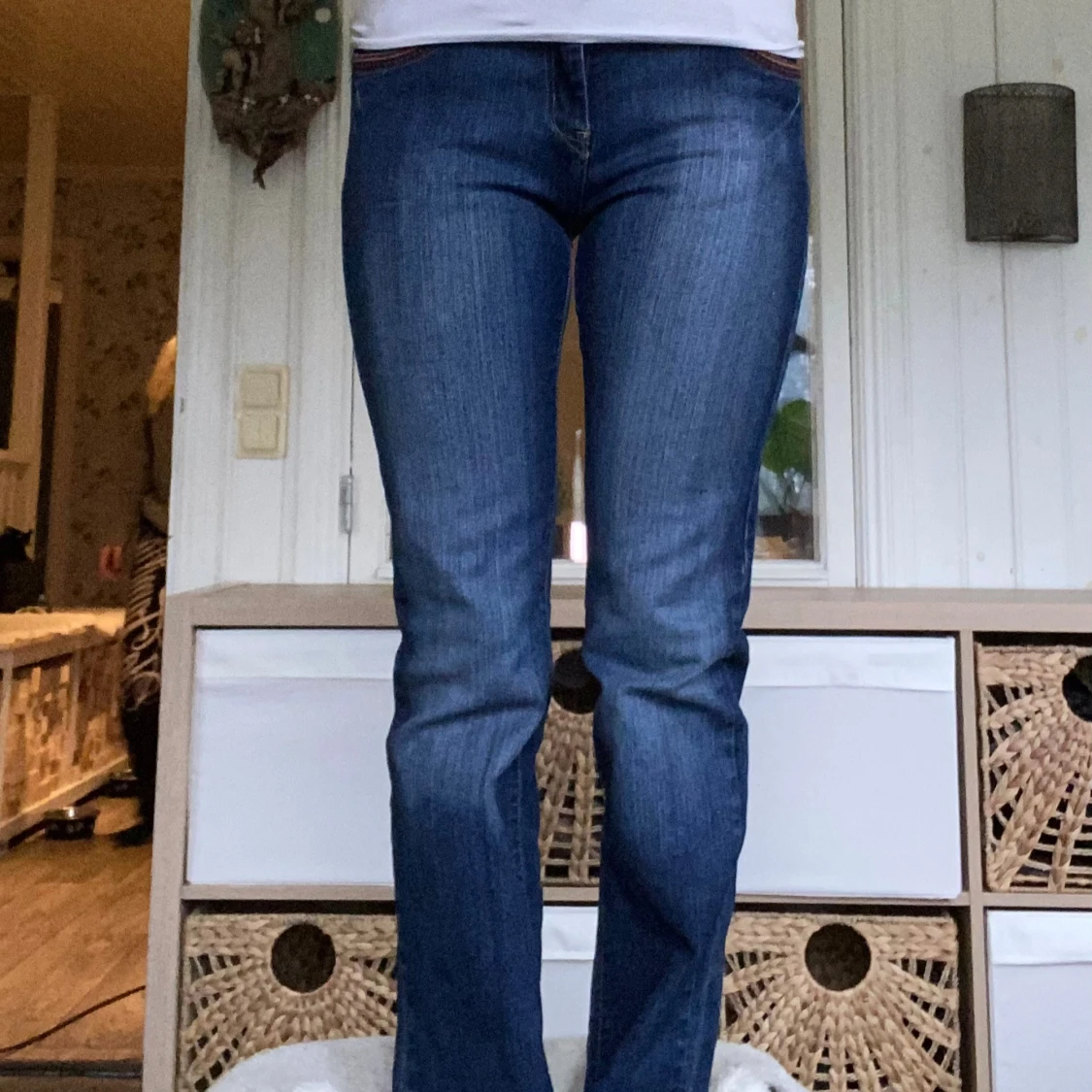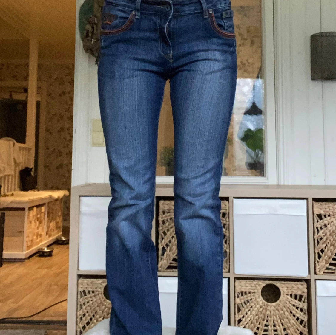 Snygga blå jeans med bootcut-modell och broderade detaljer på bakfickorna. Står att dom är XL men sitter nog bäst på M