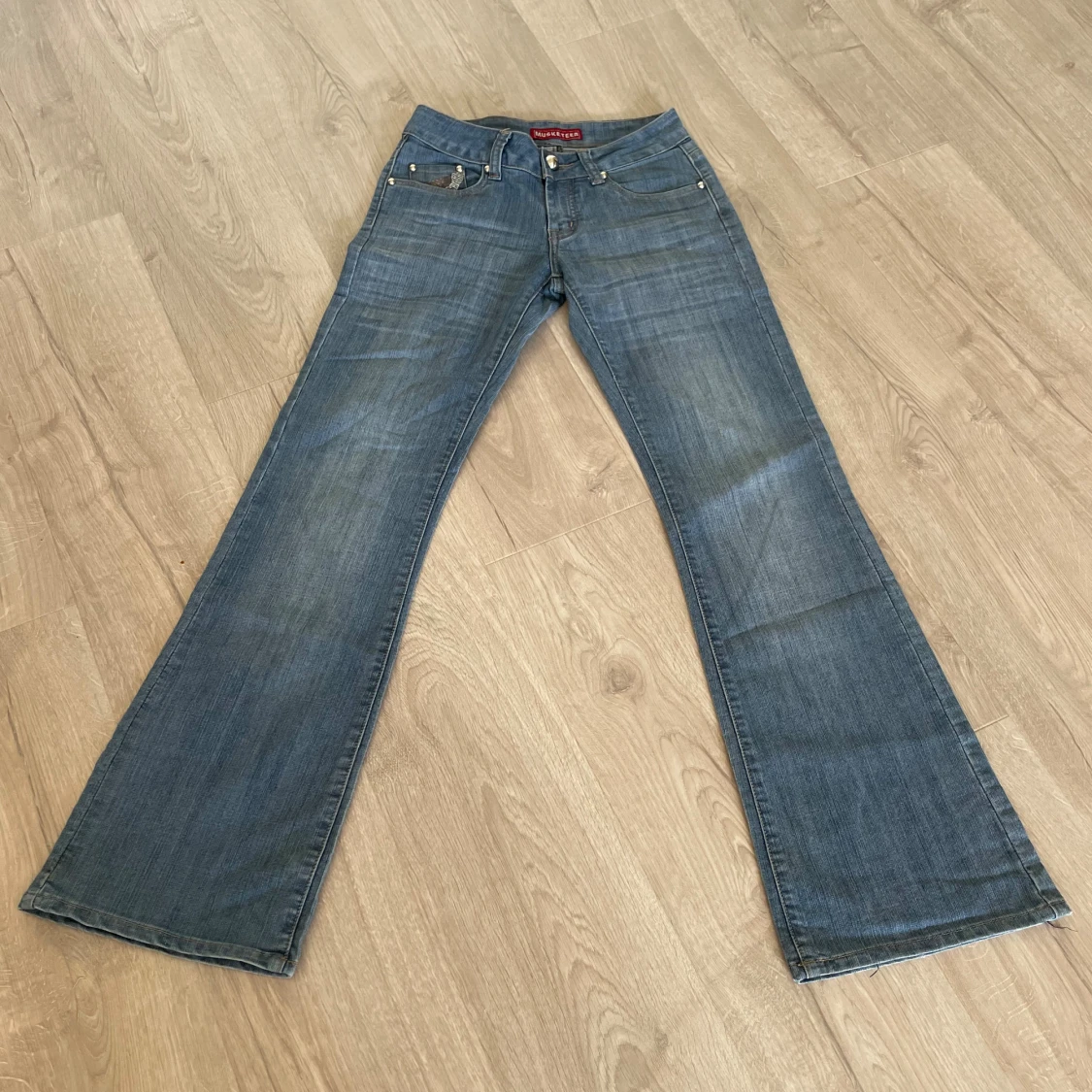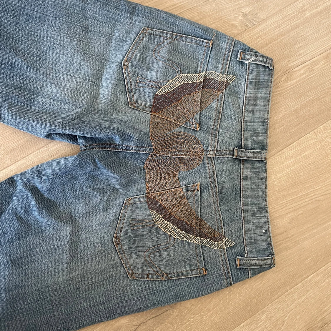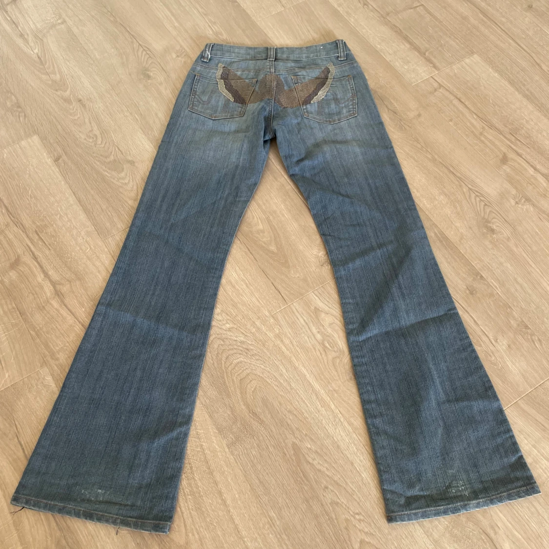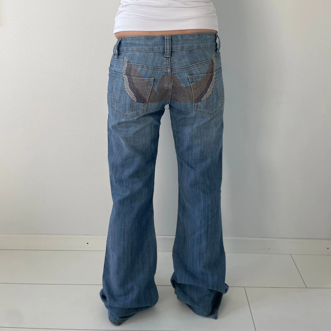 Snygga blå bootcut jeans med coolt broderat mönster i brunt och beige på bakfickorna. Jeansen har låg midja, klassisk femficksdesign och är tillverkade i mjukt denim. Perfekta för dig som gillar en avslappnad och trendig look.